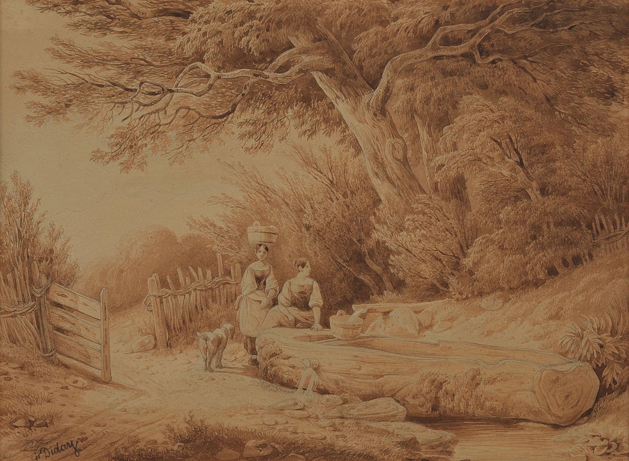 Paysans près d'une ferme, lavis bistre, signé, 18x27 cm