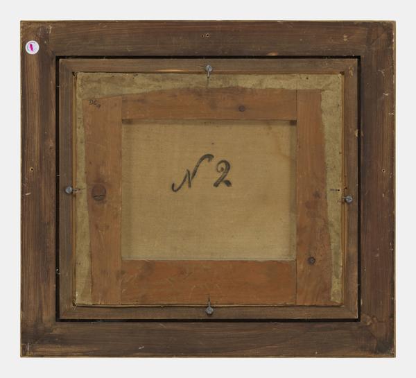 Vue de ville, scène d'interieur au dos, huile sur carton, signée...