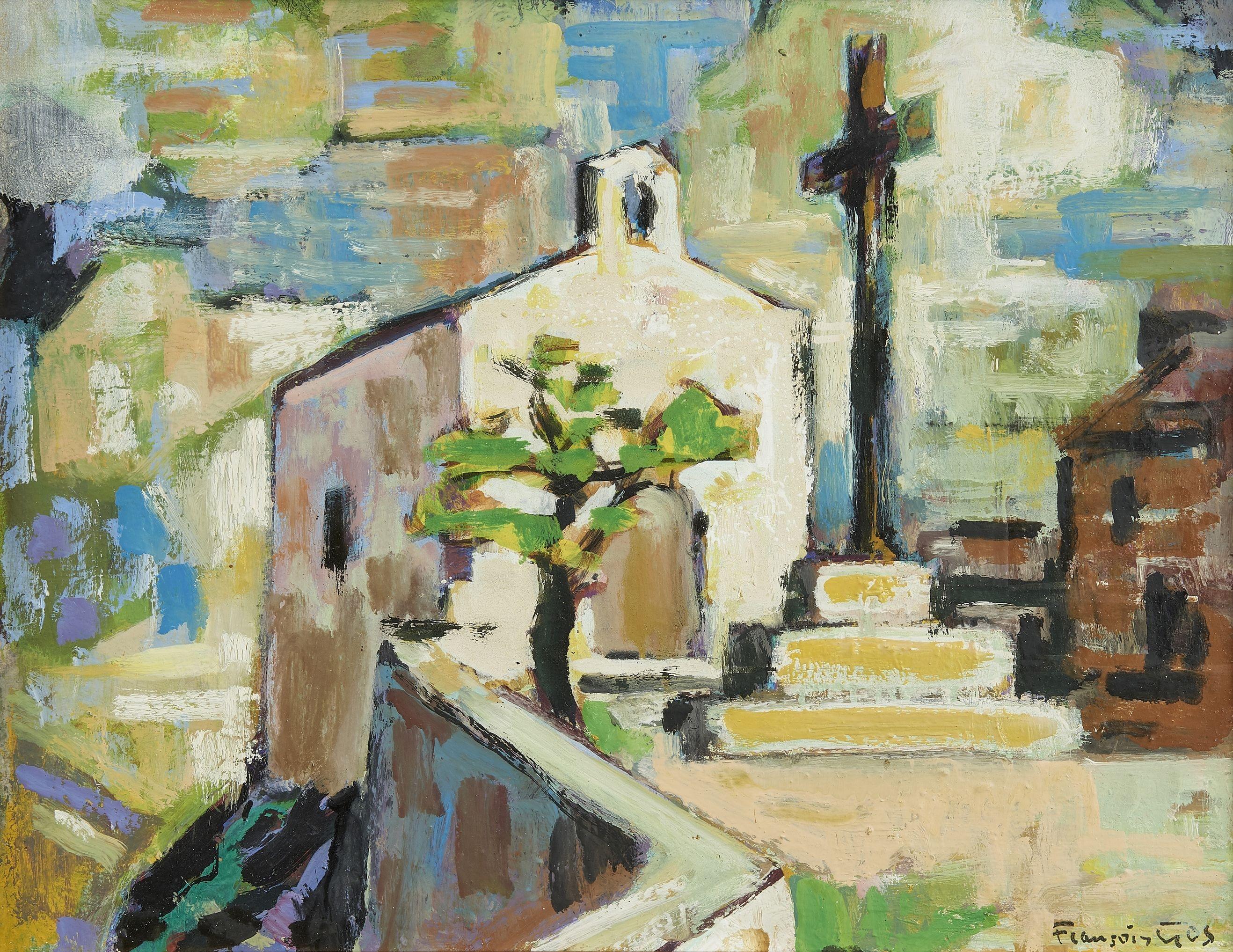 Eglise des Baux, huile sur panneau, signée et datée 1902 au dos, 40,5x50,5 cm
