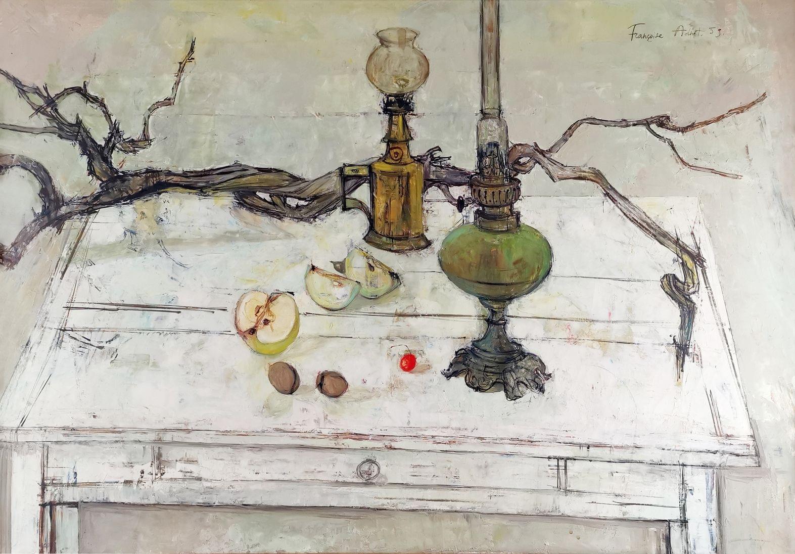 Nature morte sur table blanche, huile sur toile, 80x115 cm