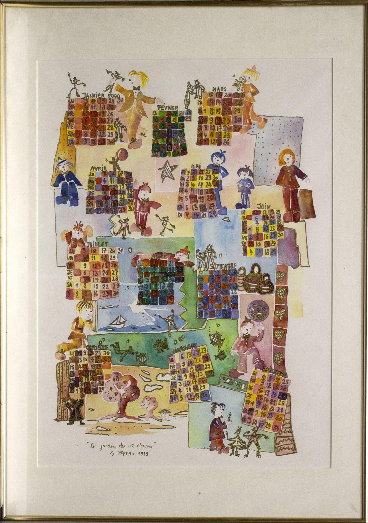 Le jardin des 12 clowns, aquarelle sur papier, signée et datée 1999, 54x40 cm