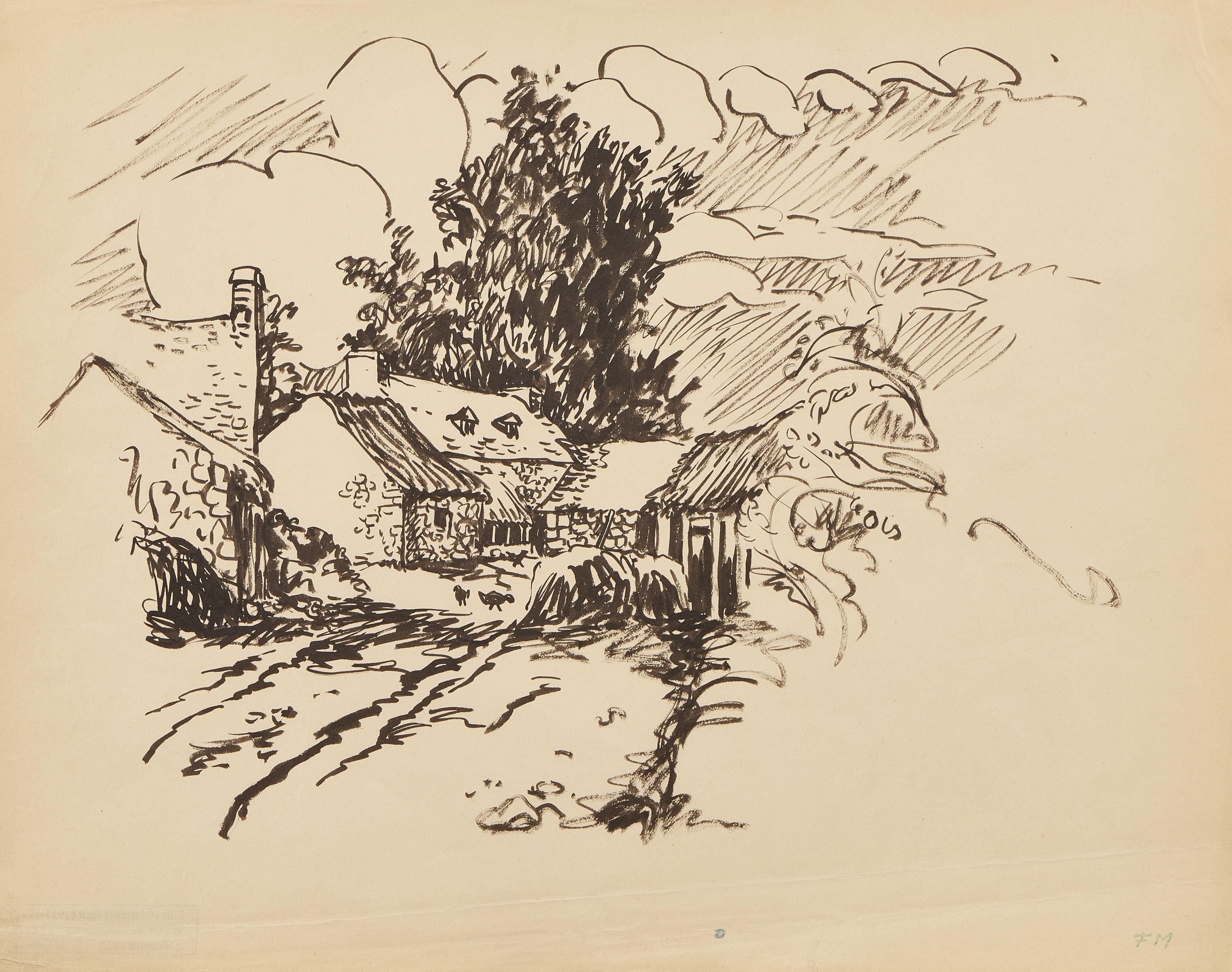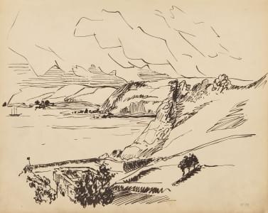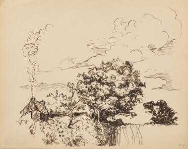 Trois esquisses à la plume figurant des paysages, encre sur papier, 26x33 cm. Accompagnées d'une lettre autographe signée de l'artiste en rapport avec ces dessins et datée 1965