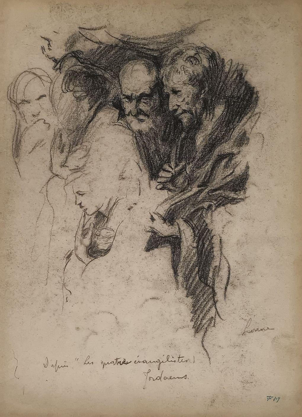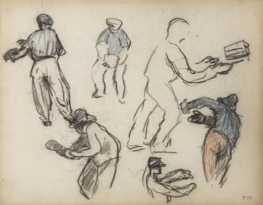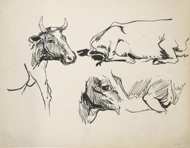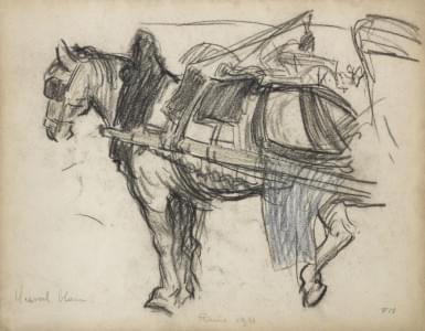 Album contenant 28 études, sujets divers dont paysages, chevaux, fusain, encre et crayons de couleur, 26x32 cm