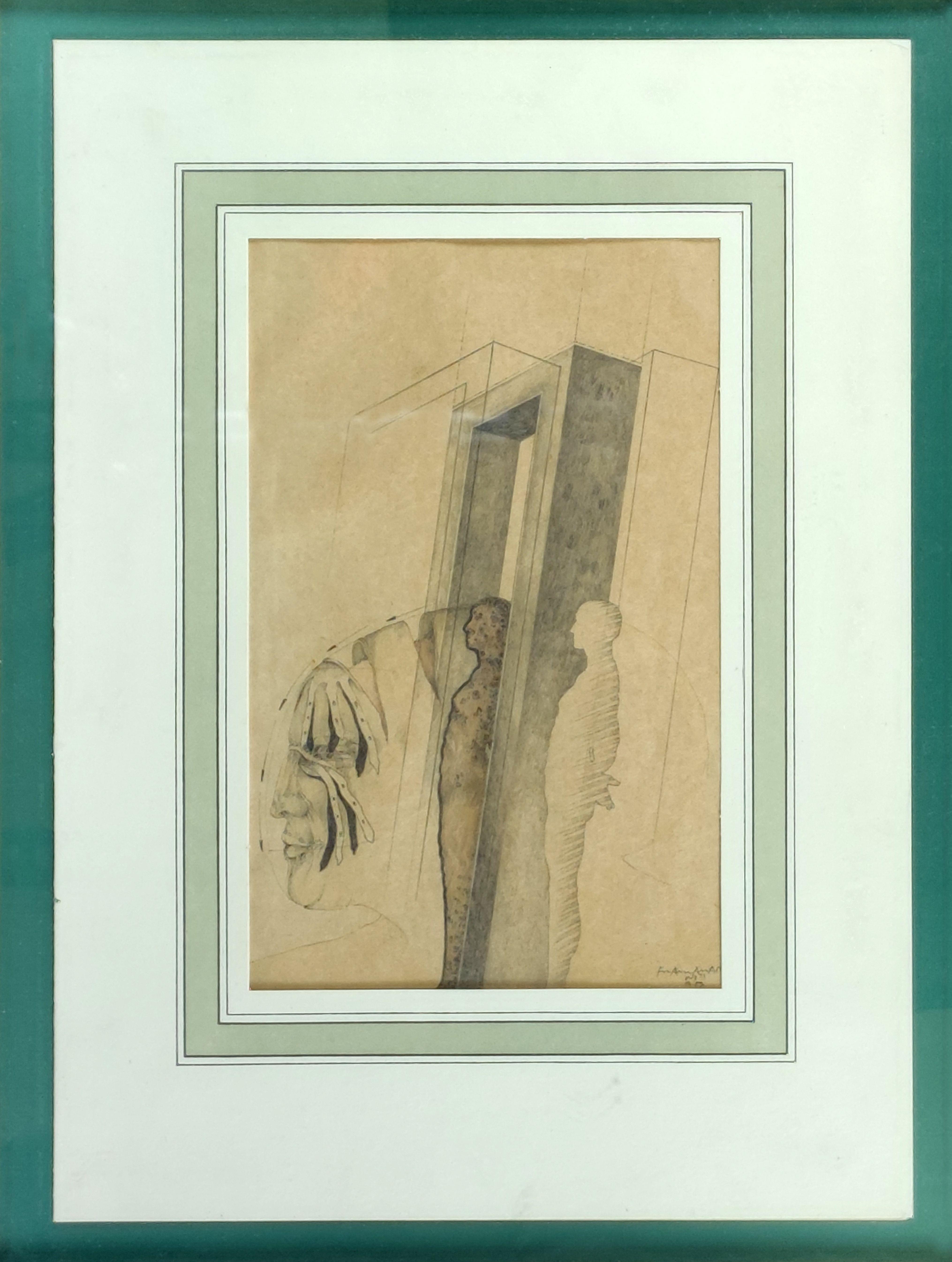 Sujet surréaliste au profil et 2 silhouettes, mine de plomb et aquarelle sur papier, signée et datée, 21x14 cm