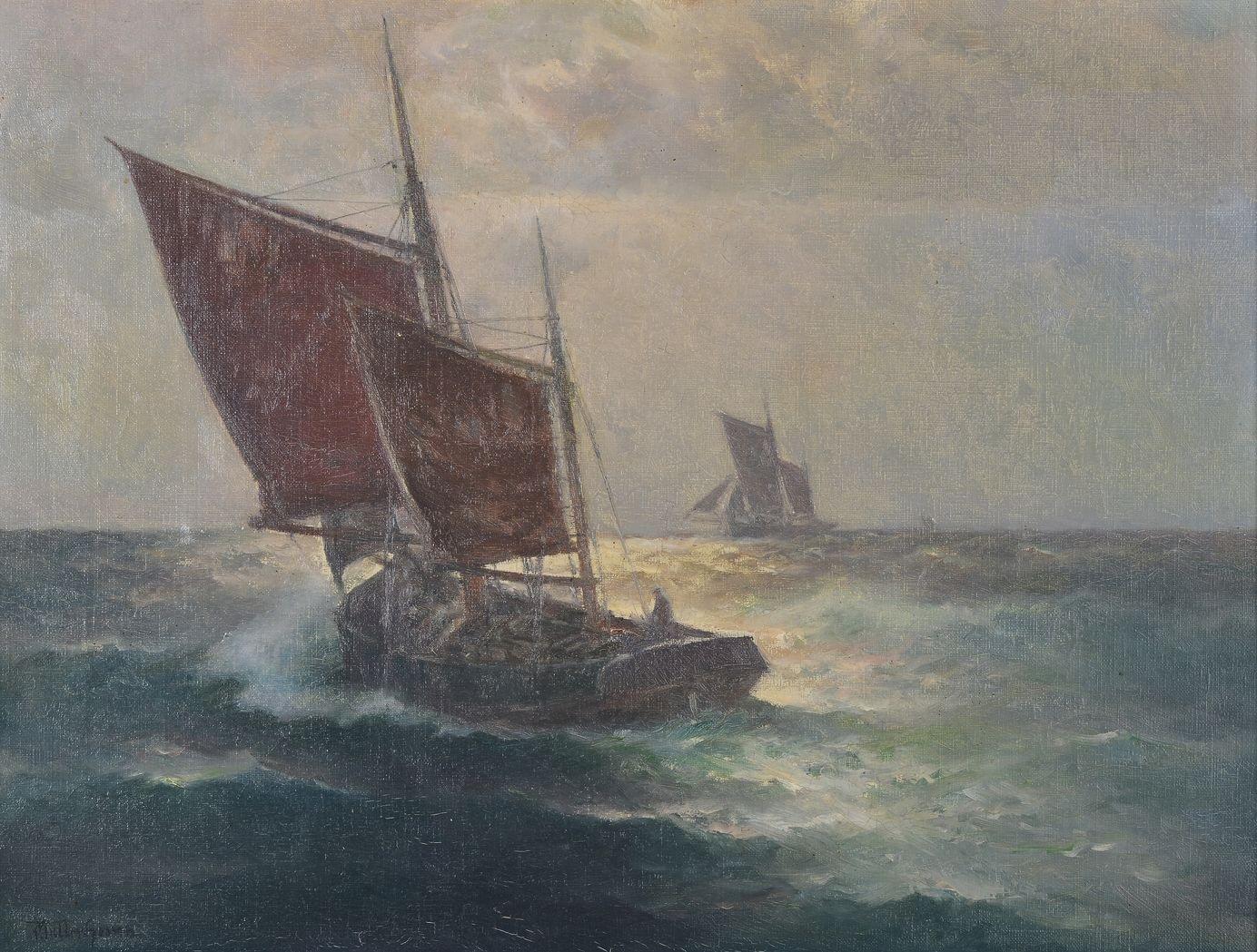 Bateau de pêche soleil couchant, huile sur toile, signée, 45x60...