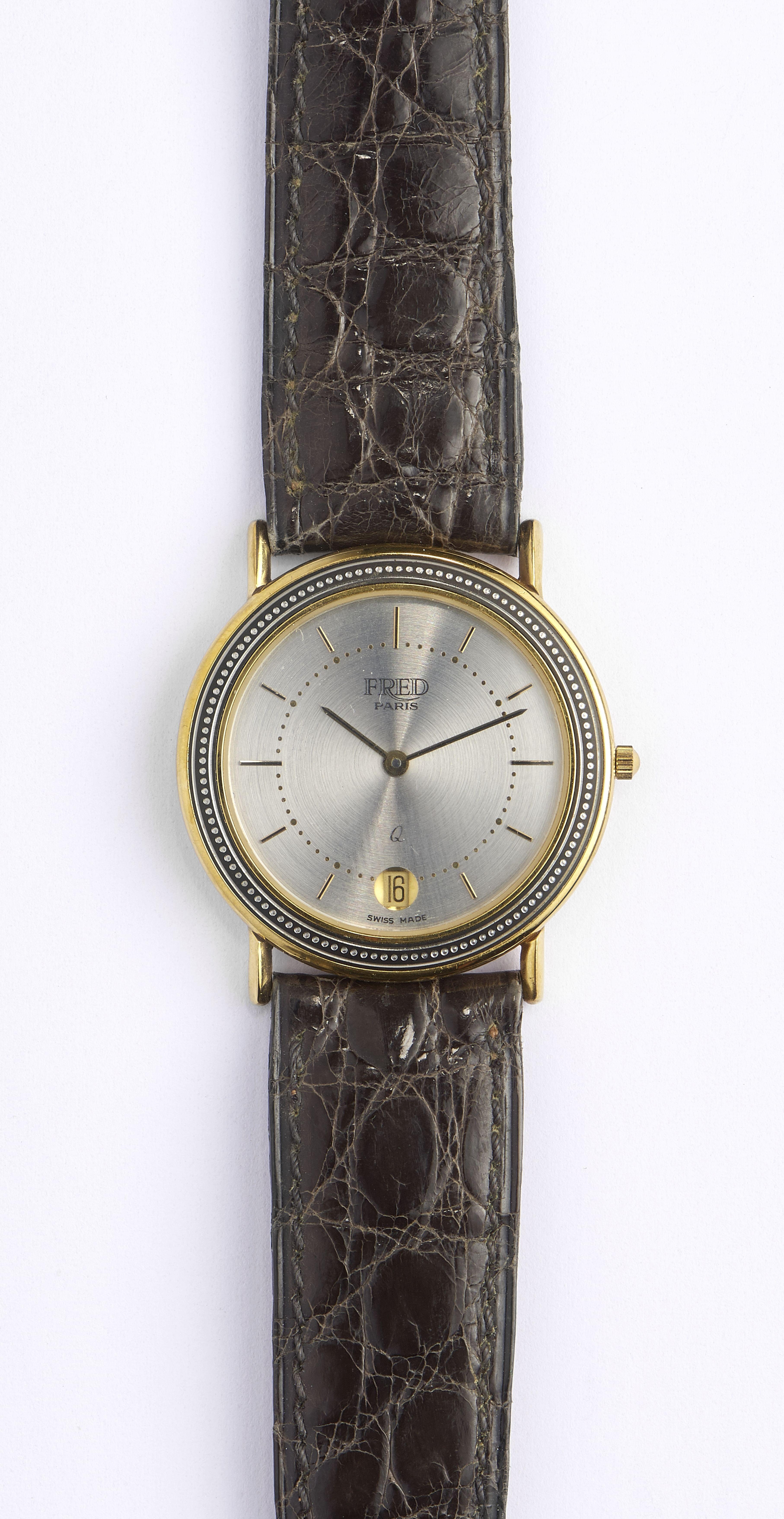 Cadran gris, aiguilles et index bâtons dorés et noirs, date à guichet à 6h, plaqué or et acier, D 32 mm