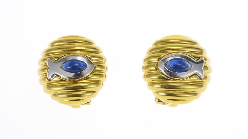 86. Fred, paire de clips d'oreilles en or godronné ornés de saphirs cabochons taille navette en serti clos