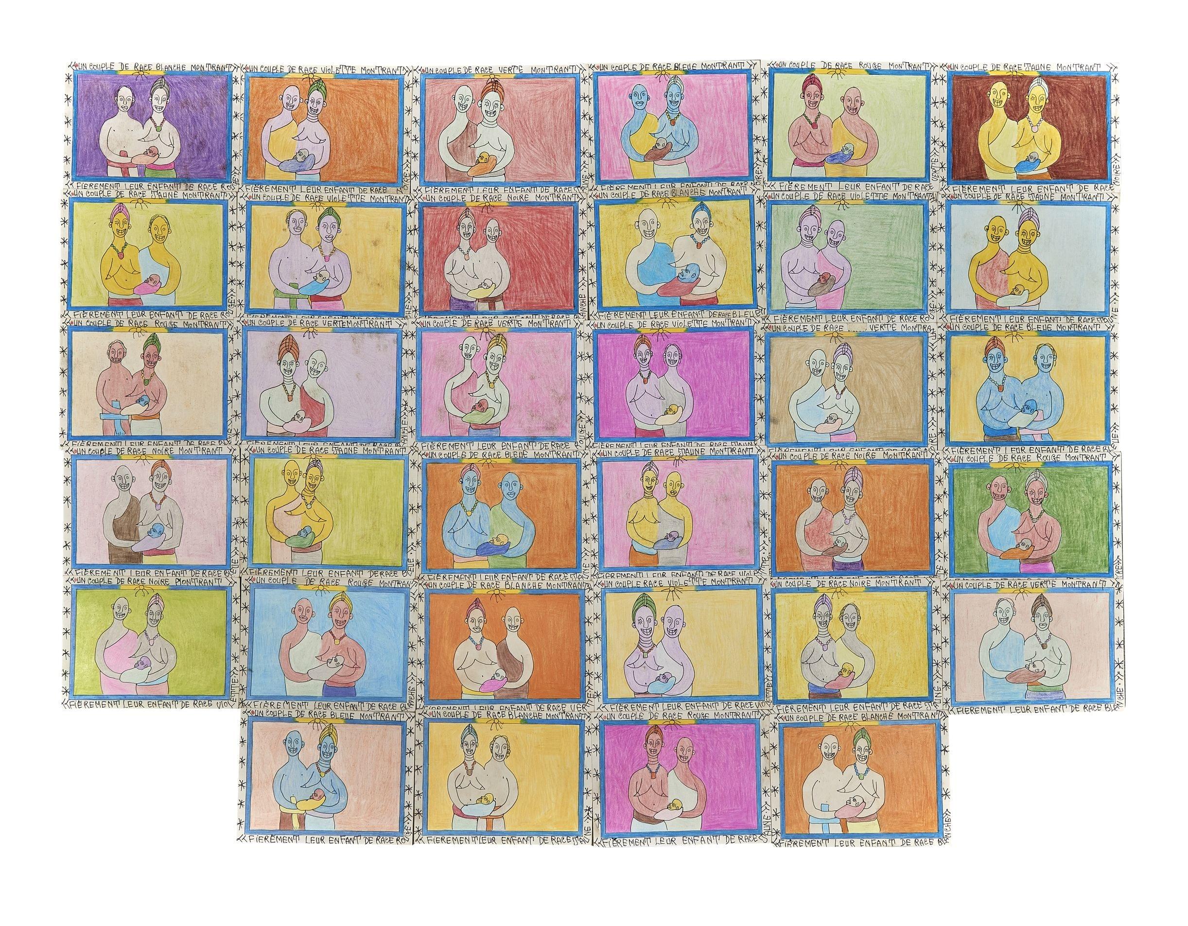 Un couple de race jaune/rouge/bleue/verte/violette/blanche montrant fièrement leur enfant de race noire/bleue/verte/blanche/rouge/violette/jaune, série de 34 dessins, stylo bille et crayons de couleurs sur carton, chacun signé et daté 2007 au dos, 15x20 cm. Provenance: famille de l'artiste
