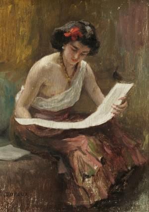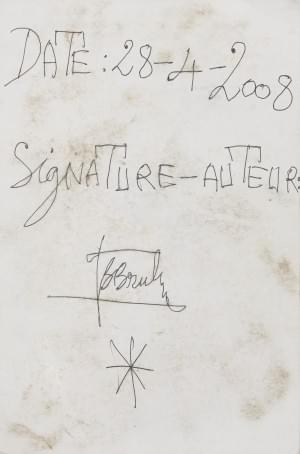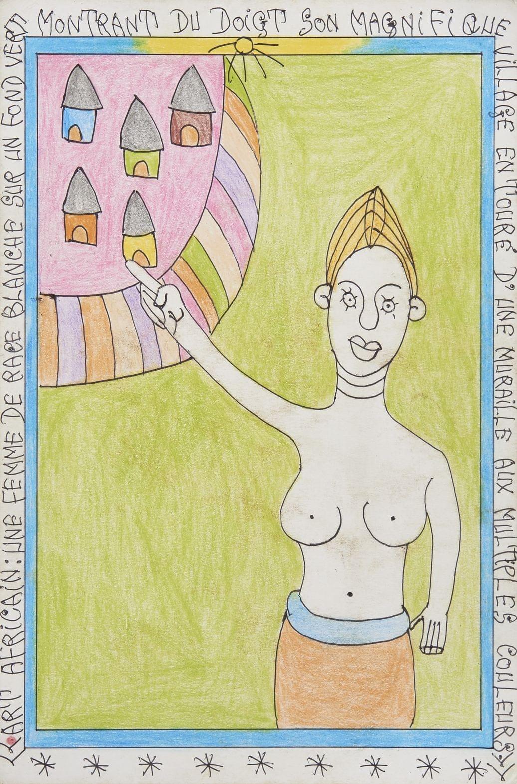 Une femme de race blanche sur un fond vert montrant du doigt son magnifique village entouré d'une muraille aux multiples couleurs, stylo bille et crayons de couleurs sur carton, signé et daté au dos 28-4-2008, 30x20 cm. Provenance: famille de l'artiste