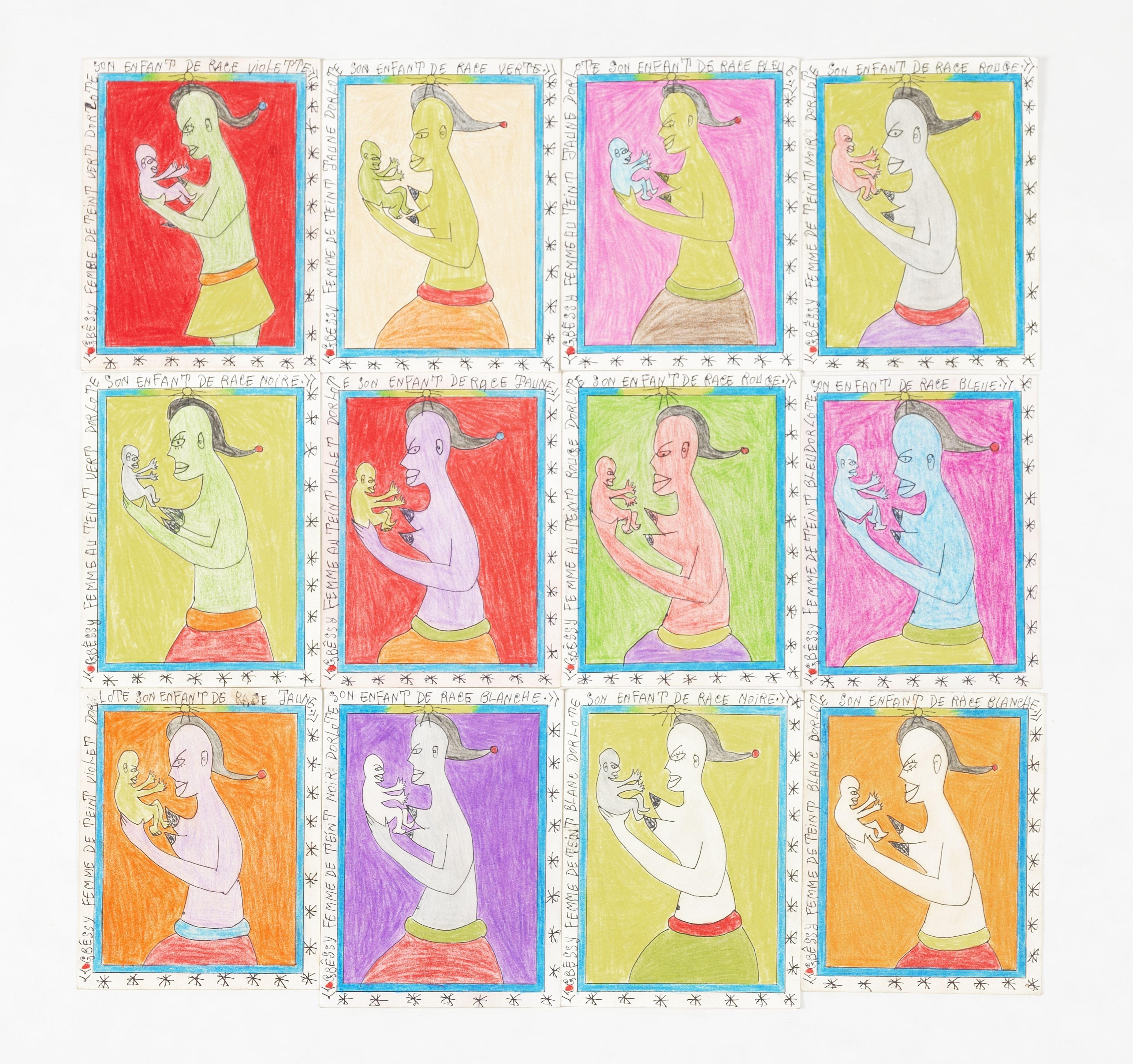 Gbéssy femme de teint violet/blanc/noir/vert/rouge/bleu/jaune dorlote son enfant de race jaune/noire/blanche/rouge/bleue/violette/verte, série de 12 dessins, stylo bille et crayons sur carton, chacun signé et daté au dos 28 mars 2009, de 15x19 à 15x20 cm. Provenance: famille de l'artiste