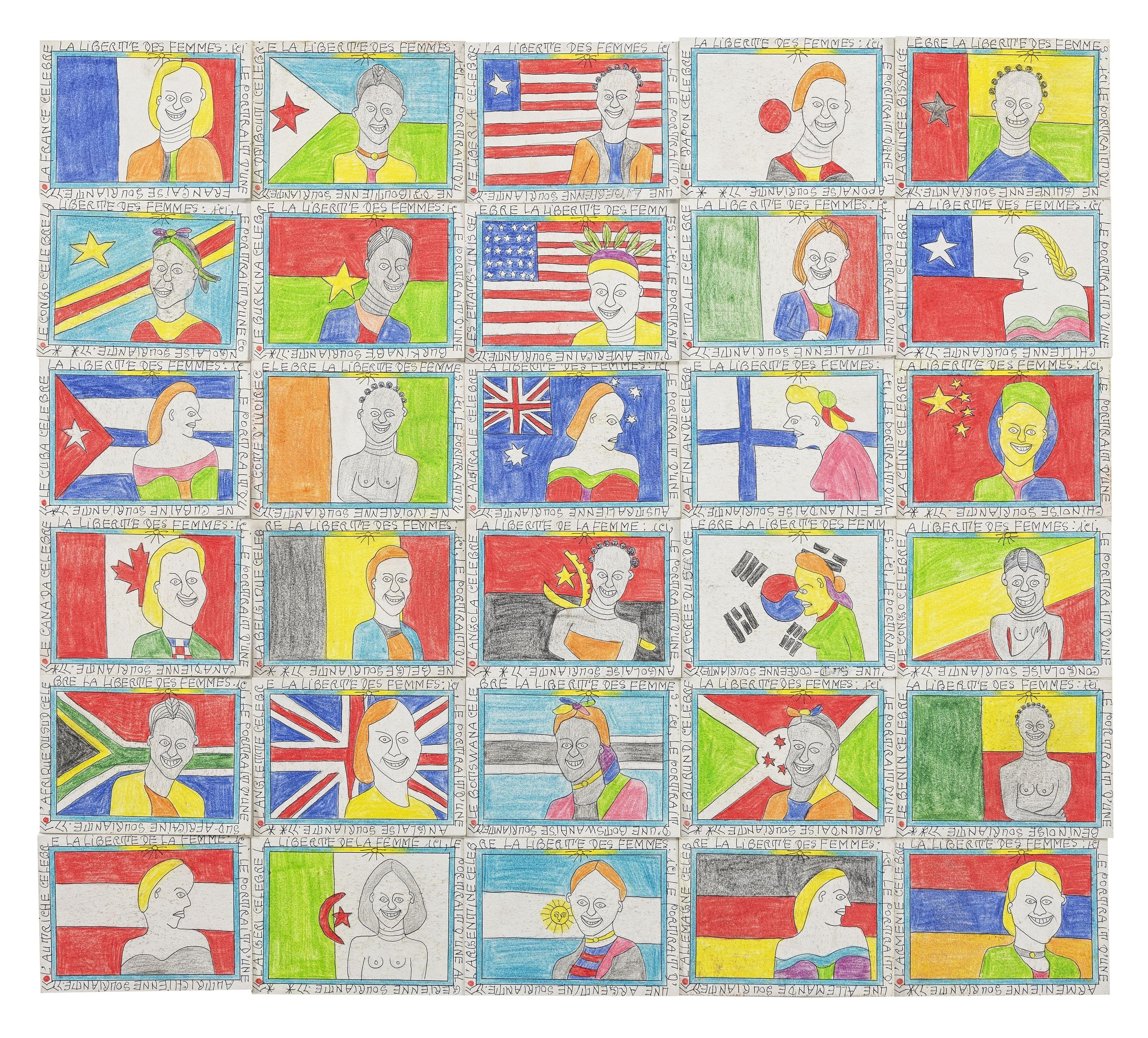 La liberté des femmes: ici le portrait d'une française/chilienne/ angolaise/anglaise/chinoise/burkinabé/congolaise/italienne/ sudafricaine/cubaine/japonaise/béninoise/autrichienne/libérienne/algérienne/argentine/belge/allemande/ivoirienne/guinéenne/djiboutienne/arménienne/botswanaise/burundaise/américaine/finlandaise/canadienne/sud-coréenne/australienne, série de 30 dessins, stylo bille et crayons sur carton, chacun signé et daté au dos entre le 4 et le 9 août 2008, 18x13 cm.