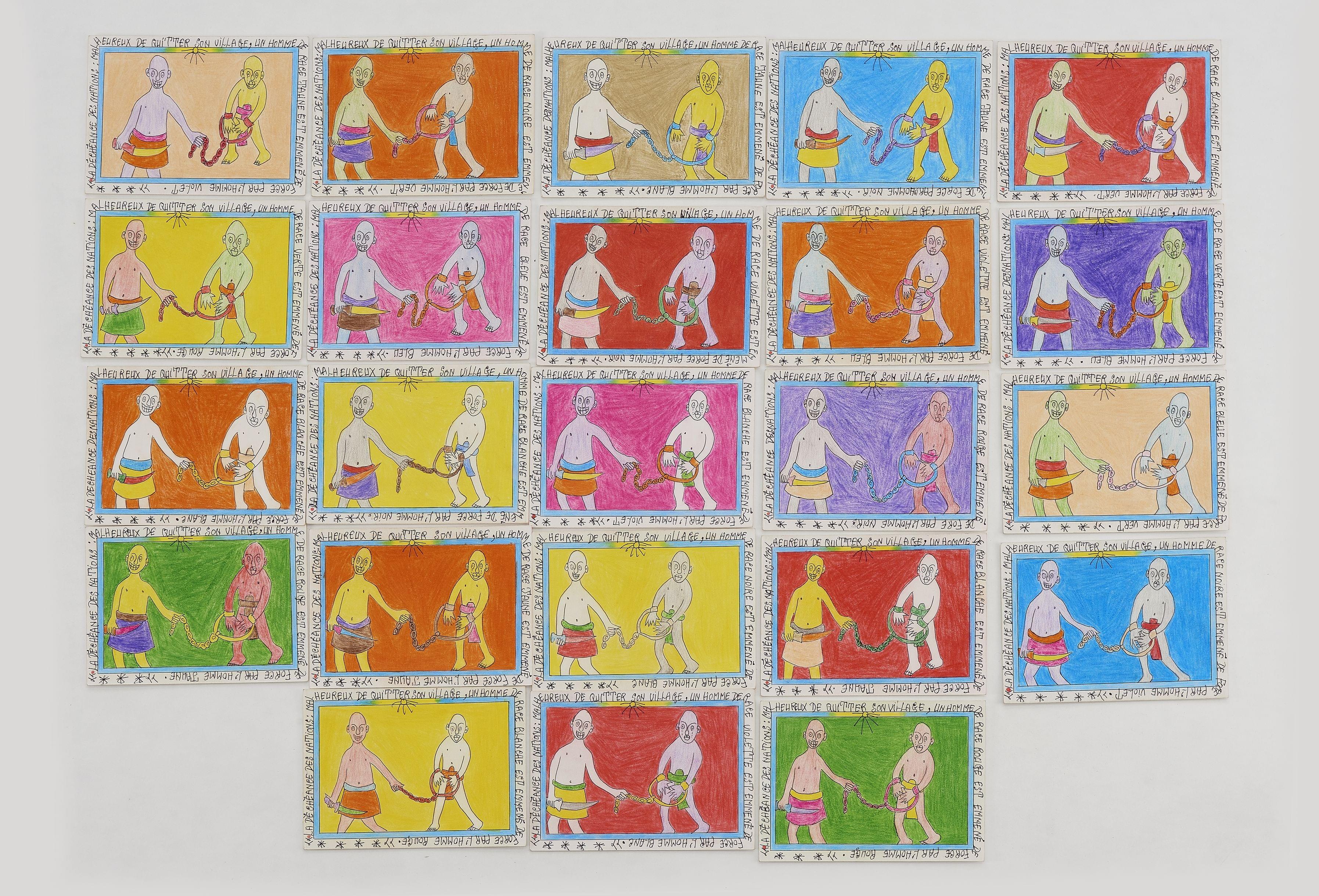 La déchéance des nationgs: Malheureux de quitter son village, un homme de race violette/blanche/jaune/verte/rouge/noire/bleue, verte est emmené de force par l'homme bleu/noir/blanc/jaune/rouge/vert/noir/violet, série de 23 dessins, stylo bille et crayons de couleur sur carton, chacun signé et daté au dos entre le 4 et 5 novembre 2009, 14,5x20 cm. Provenance: famille de l'artiste