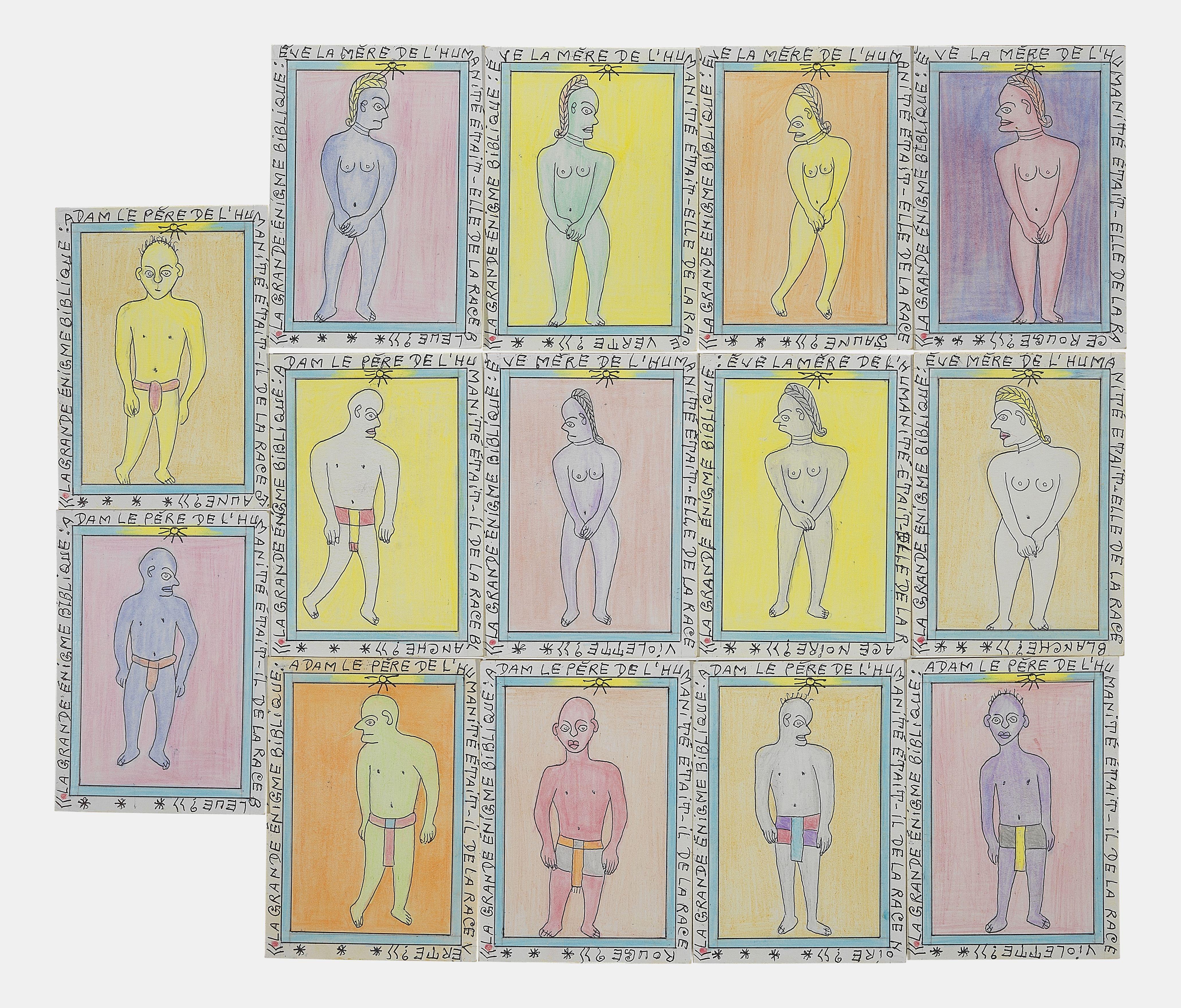 La grande énigme biblique: Eve, la mère de l'humanité était-elle de la race noire/violette/blanche/rouge/jaune/verte/bleue et Adam, le père de l'humanité était-il de la race noire/violette/blanche/rouge/jaune/verte /bleue, ensemble de 14 dessins, stylo-bille et crayons de couleurs sur carton, chacun signé et daté au dos 16 octobre 2009, 17x12 cm. Provenance: famille de l'artiste