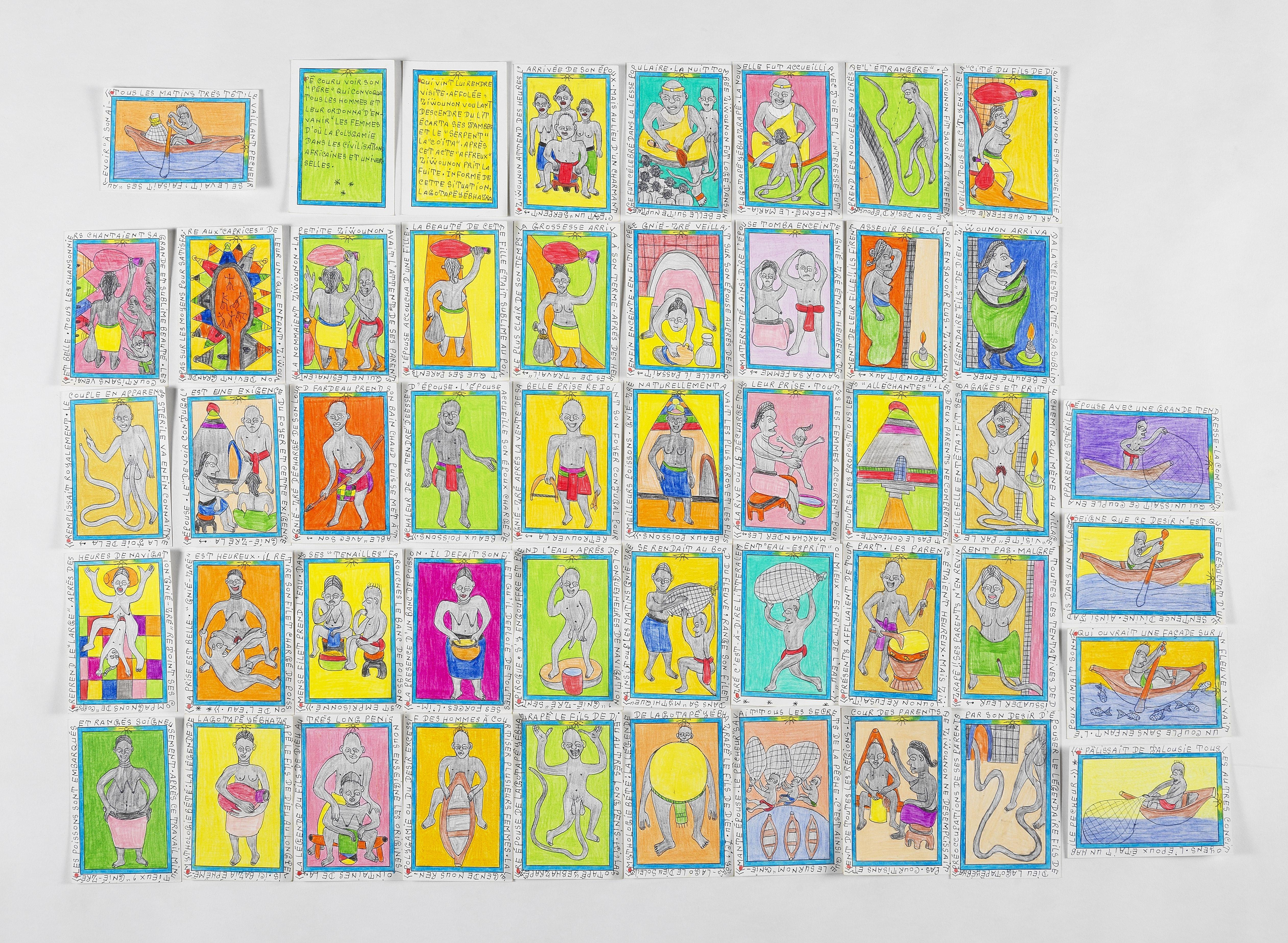 Mythologie bété: la légende de lagotapêyébhazrapê le fils de Dieu. Ici Yôrô-Lago le Dieu soleil.Tous les matins très tôt, le vaillant pêcheur se levait, faisait ses "aurevoir" à son ai/mante épouse.Ziwounon attend des heures l'arrivée de son époux. Mais au lieu d'un charmant c'est un "serpent", série de 48 dessins, stylo bille et crayons de couleurs sur carton, chacun signé, daté au dos entre le 9 et 10 mai 2008 et numérotés de 1 à 48, 18x12 cm. Provenance: famille de l'artiste