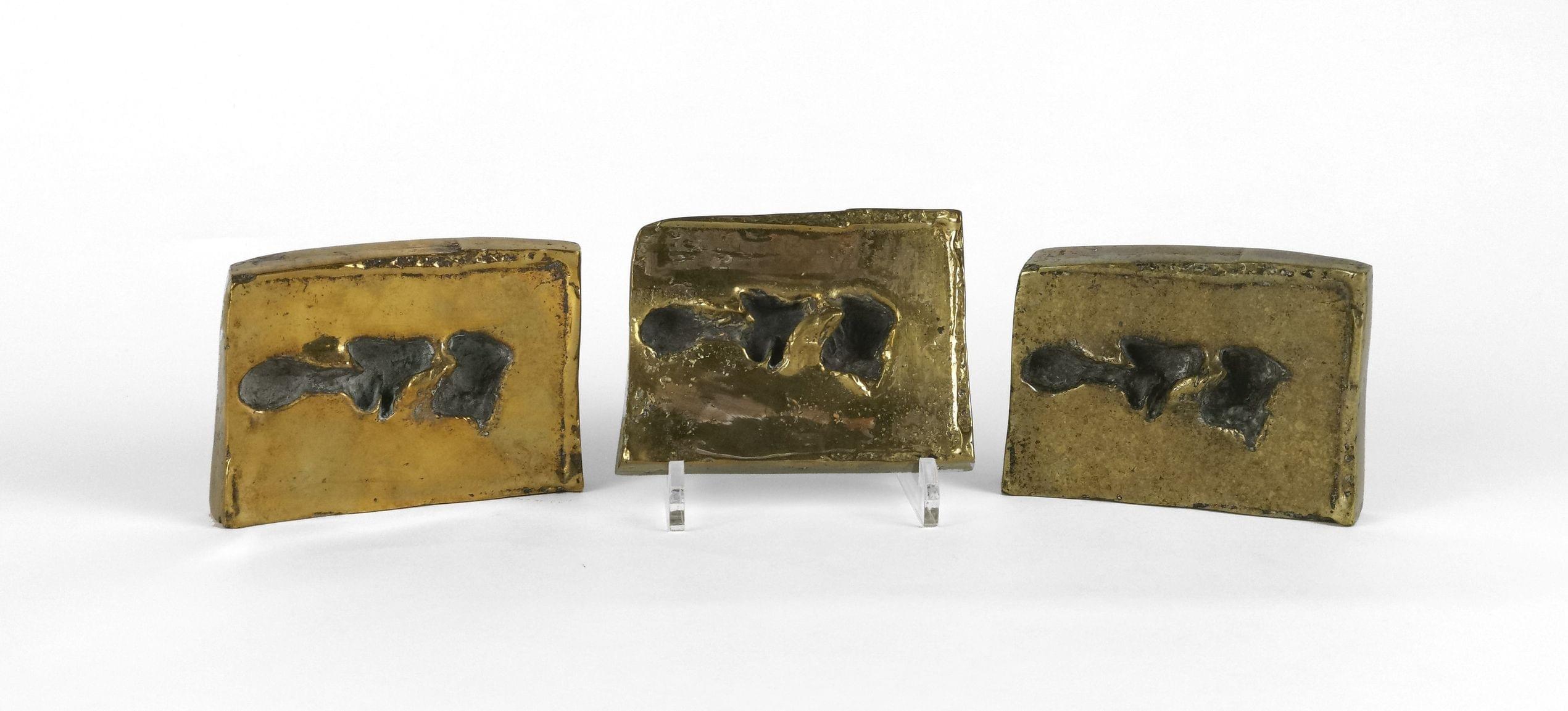 Empreintes, trois éléments en bronze à patine dorée, monogrammés et numérotés, 2x10,5x8 cm