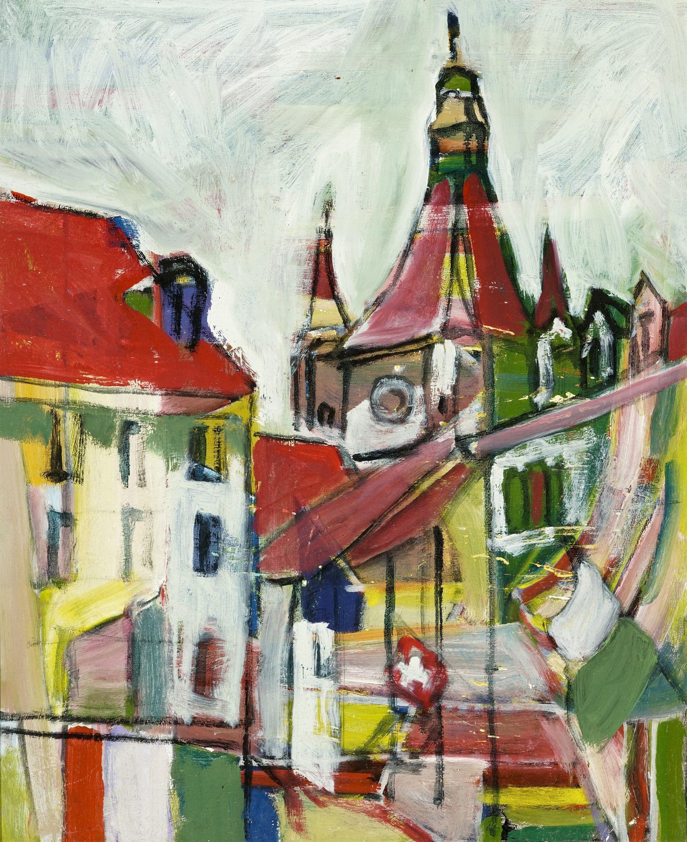 Clocher du Village, huile sur carton, tampon de l'artiste au dos, 40x38 cm