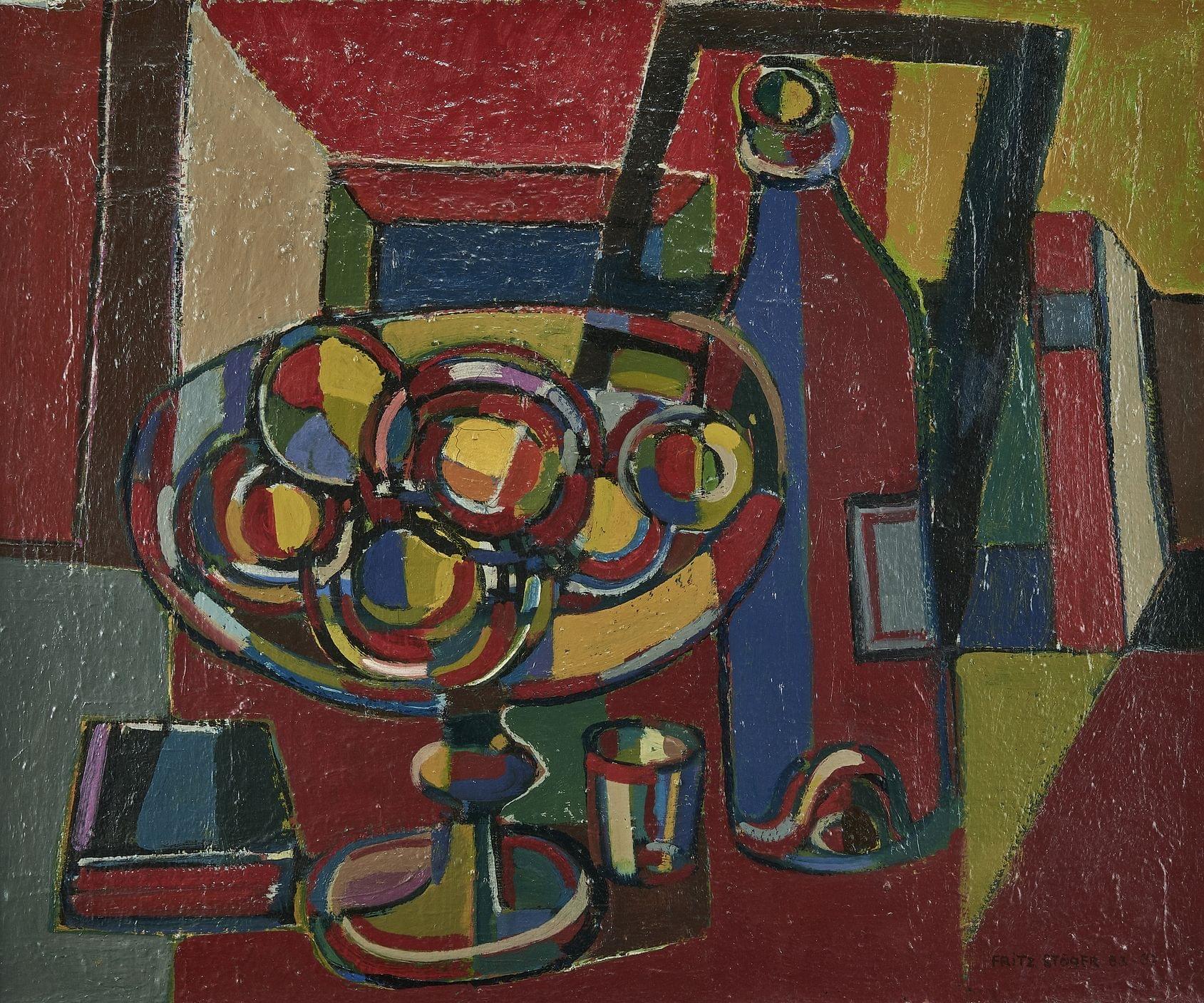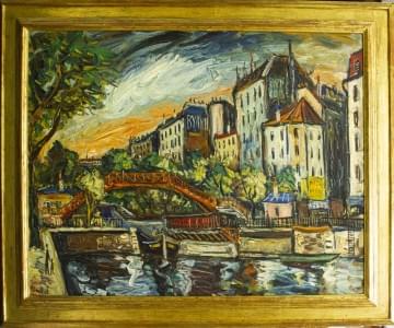Vue du village, huile sur pavatex, 65x54 cm. On joint une affich...