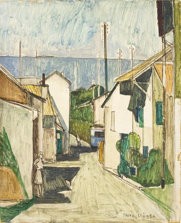 Vue du village, huile sur pavatex, 65x54 cm. On joint une affich...