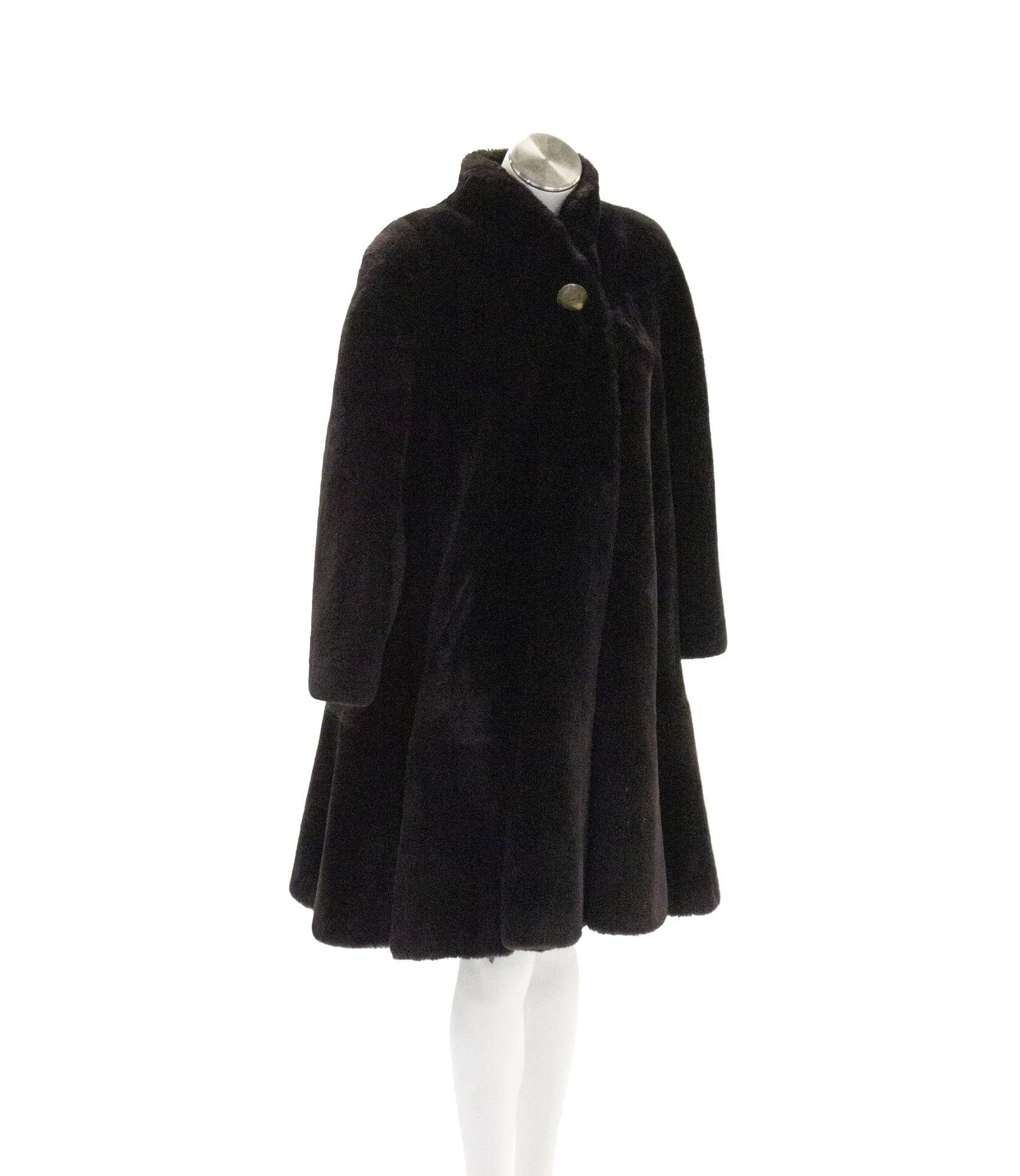 Fourrure brune probablement castor, intérieur en tissu brun, fermeture à crochets, deux poches latérales, bouton ornemental doré