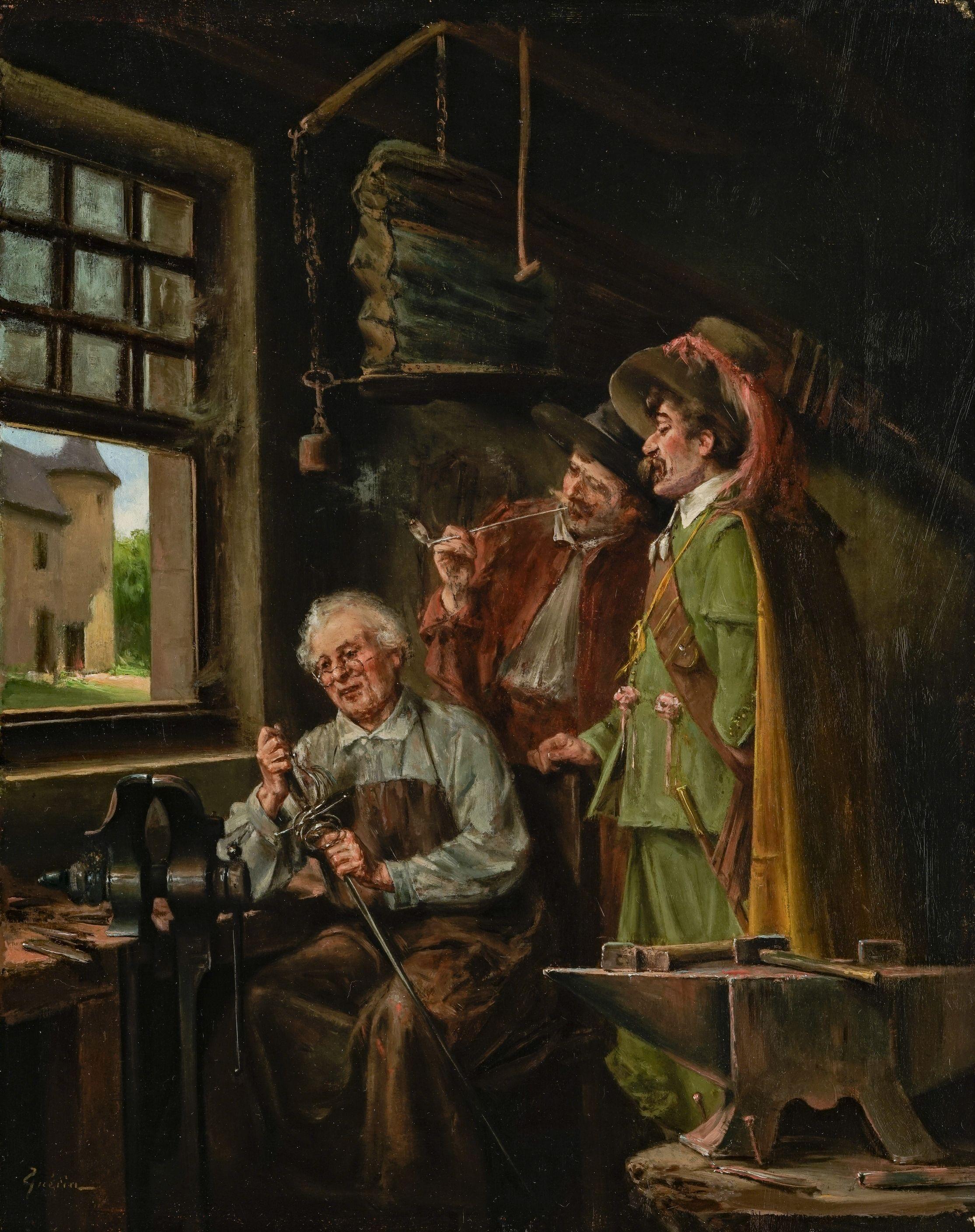 Deux mousquetaires au forgeron, huile sur toile, signée, 41x33 cm