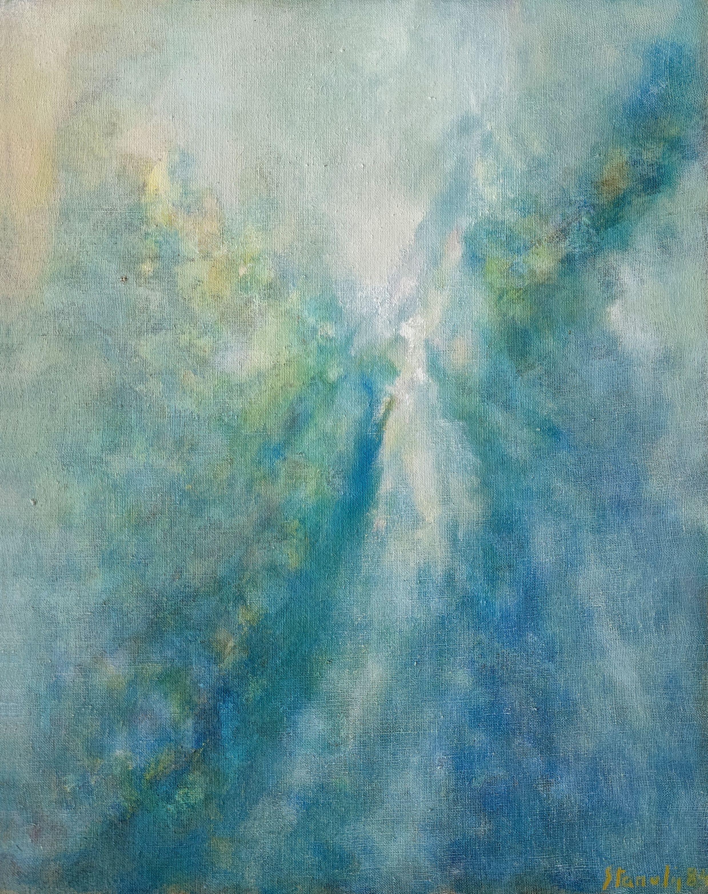 Composition bleue, huile sur toile, signée et datée 1984, 55x46 cm