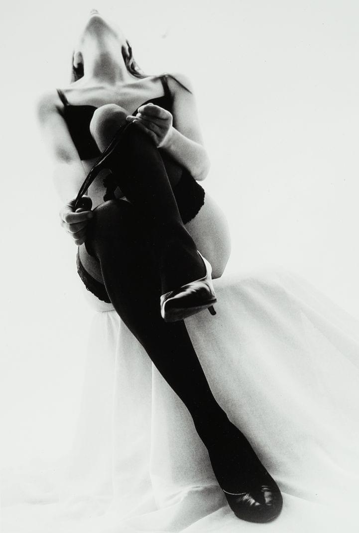 Femme enfilant sa jupe, tirage argentique en noir et blanc, cach...