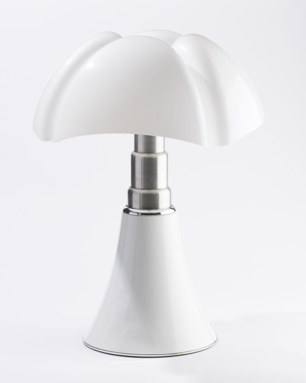 Lampe de table Pipistrello, métal laqué blanc, plastique blanc, édition Martinelli Luce, 1970, H 87 cm