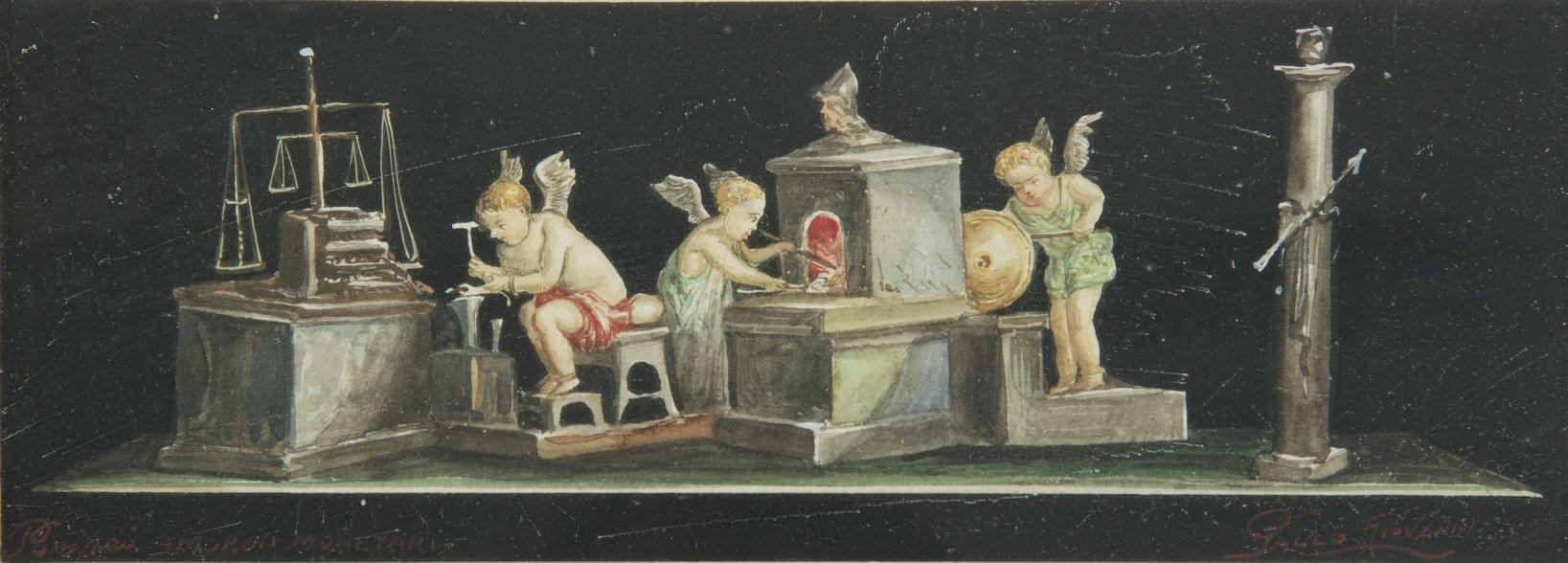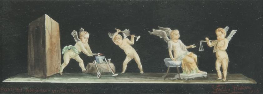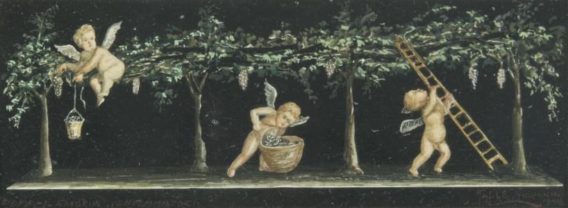 Putti forgeron, putti justicier et putti vendange, trois gouaches sur papier, signées et datées 1952, 7,5x20 cm