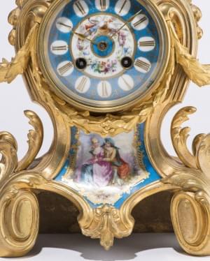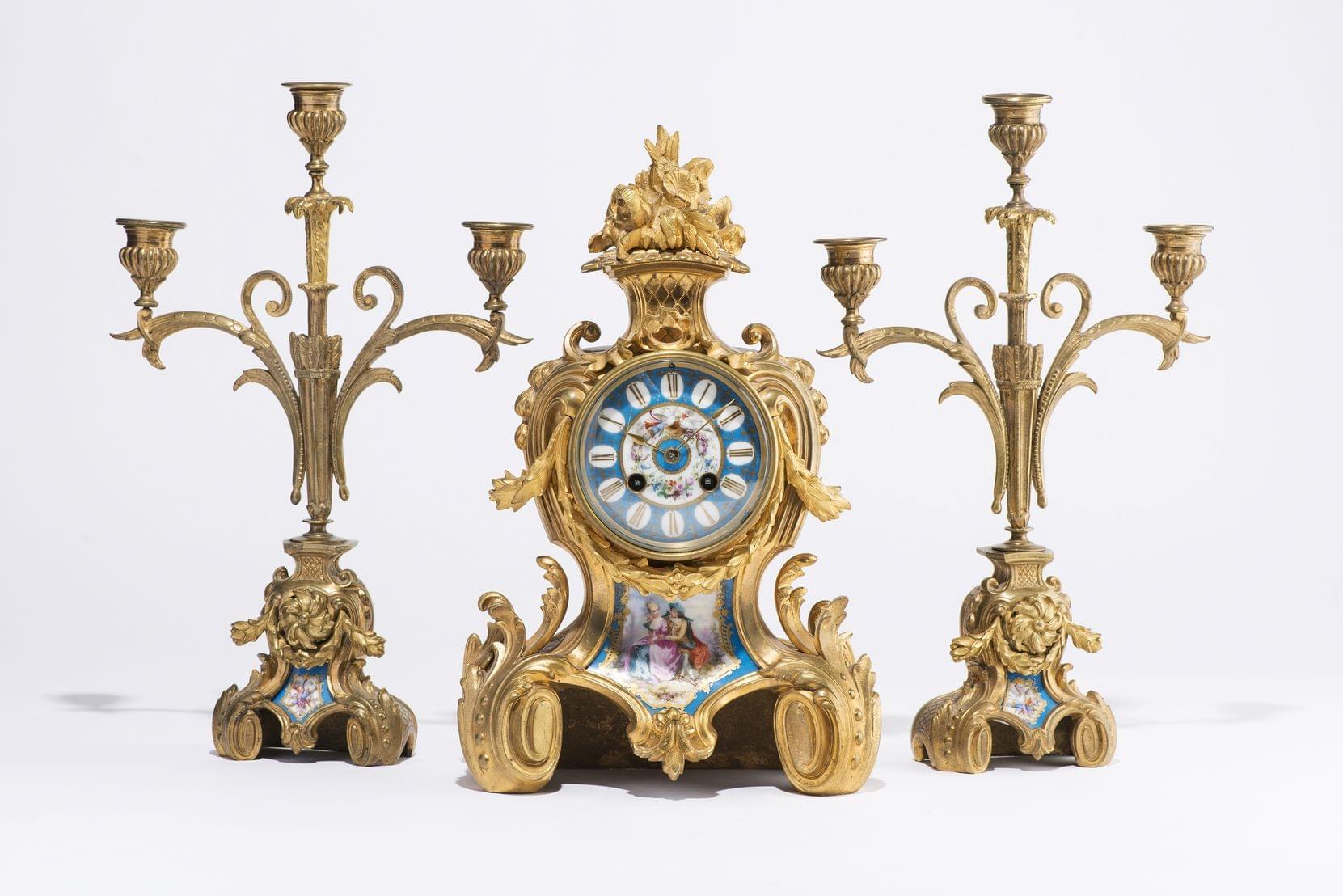 Comprenant une pendule et une paire de candélabres, bronze doré, porcelaine émaillée à décor de scènes galantes et fleurs sur fond bleu