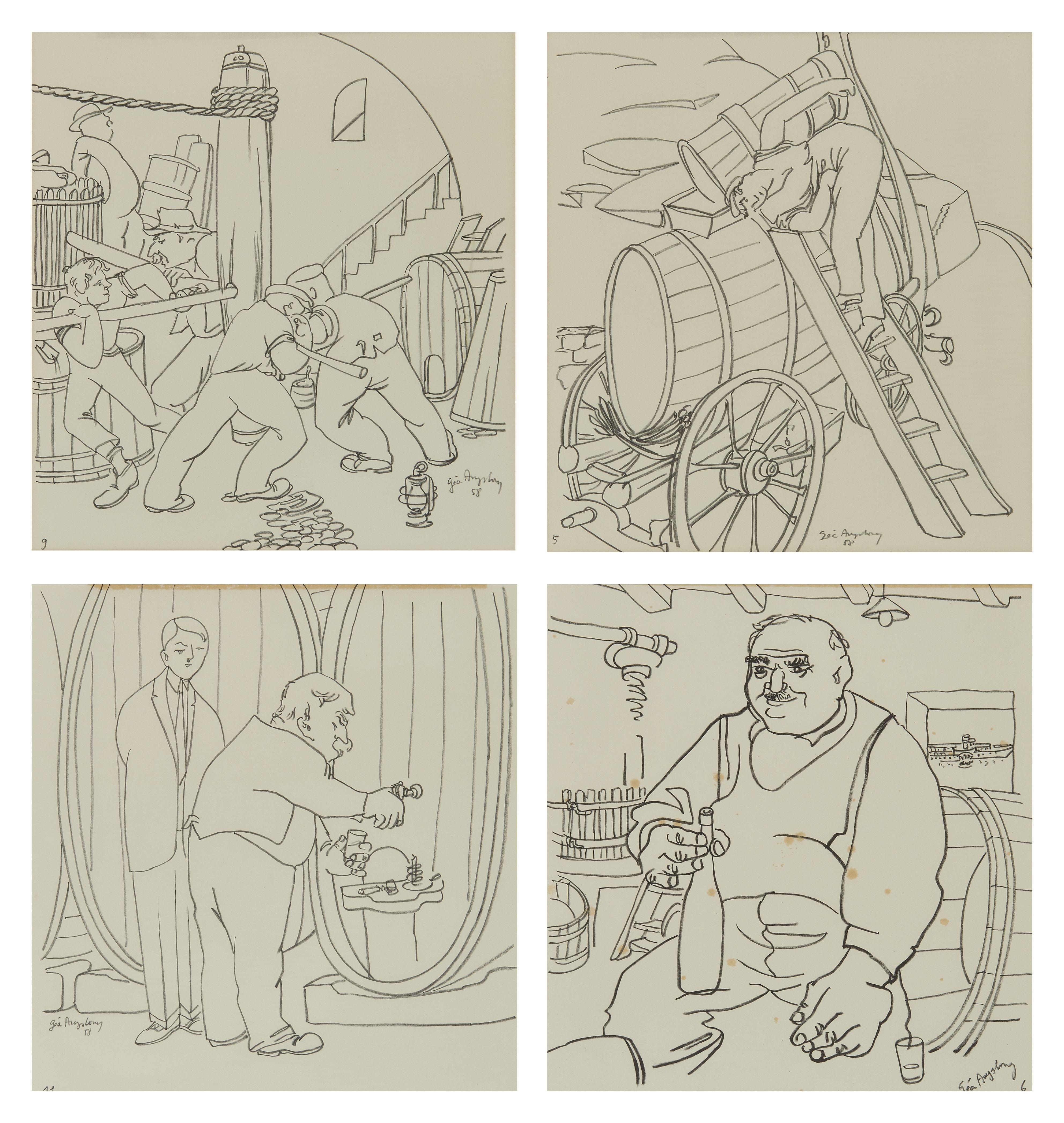 Les vendanges, quatre mines de plomb sur papier, signées et datées 58, 34x31 cm
