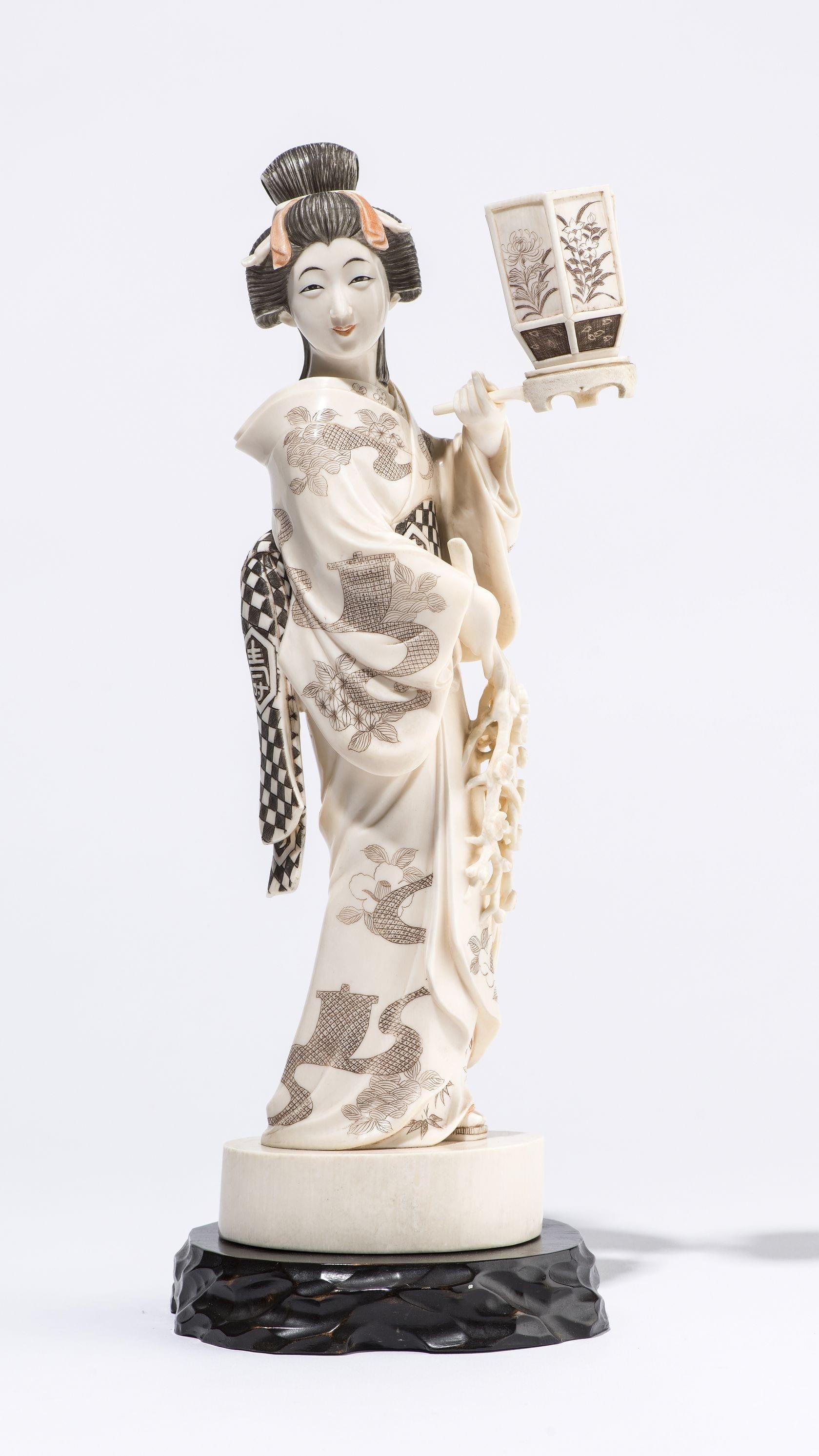 Okimono, ivoire sculpté et gravé, signé, Japon, H 34 cm