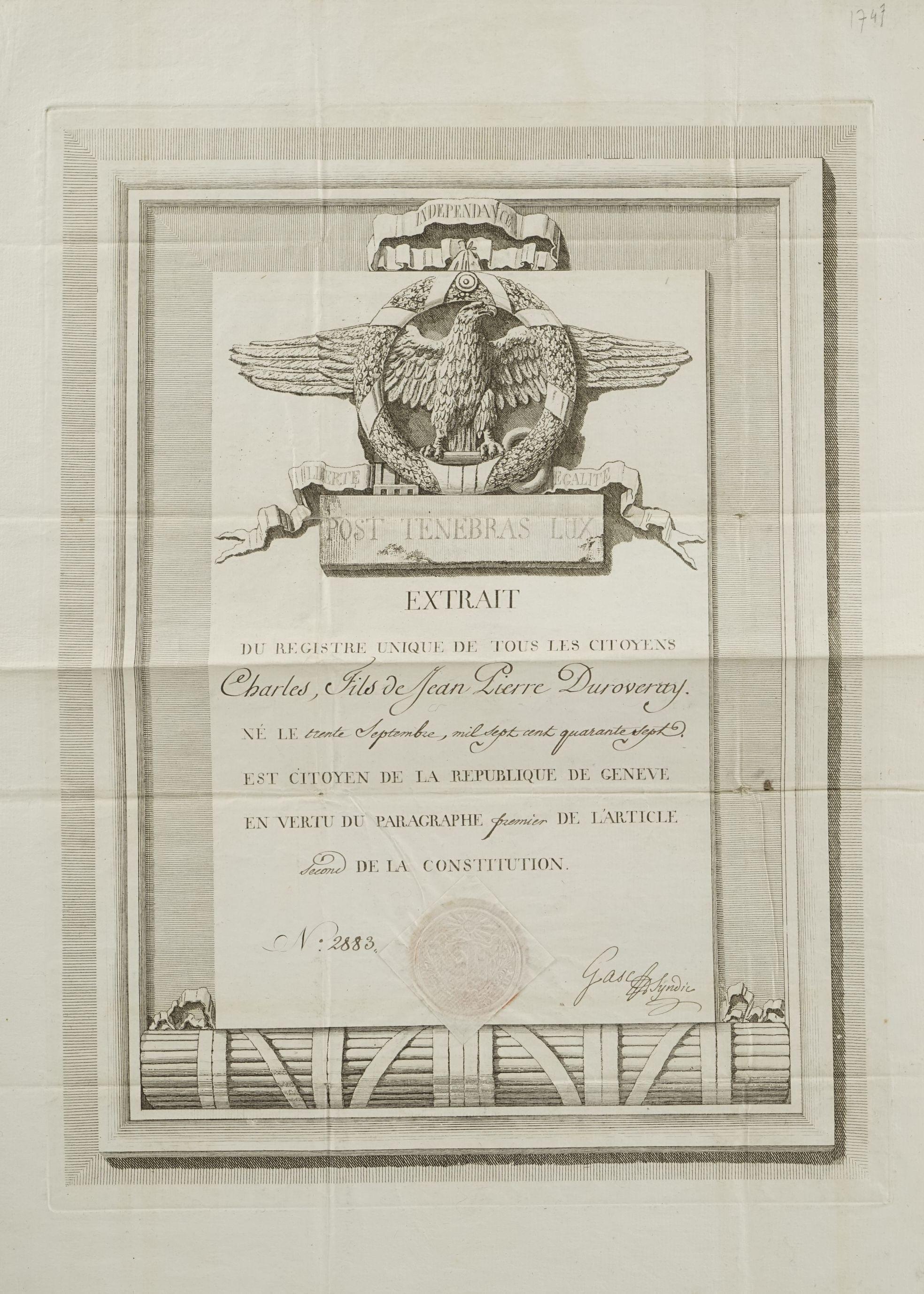 12. GENEVE. Important ensemble de documents manuscrits (pour 24 d’entre eux) et imprimés (pour les quatre derniers), concernant principalement la navigation et les barques sur le Lac Léman, concédée au sieur Charles Duroveray, citoyen de Genève, né le 30 Septembre 1747