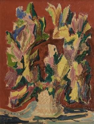 Bouquet de fleurs sur fond rouge, huile sur carton, signée, 46x3...