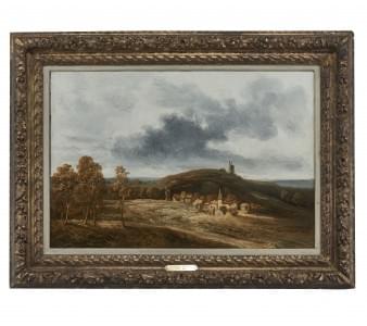 Paysage au village et au moulin, huile sur toile, 48x72 cm
