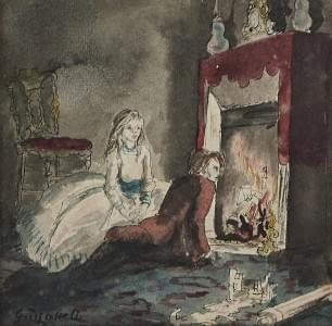 Couple devant la cheminée, aquarelle sur papier, signée, 15x15 c...