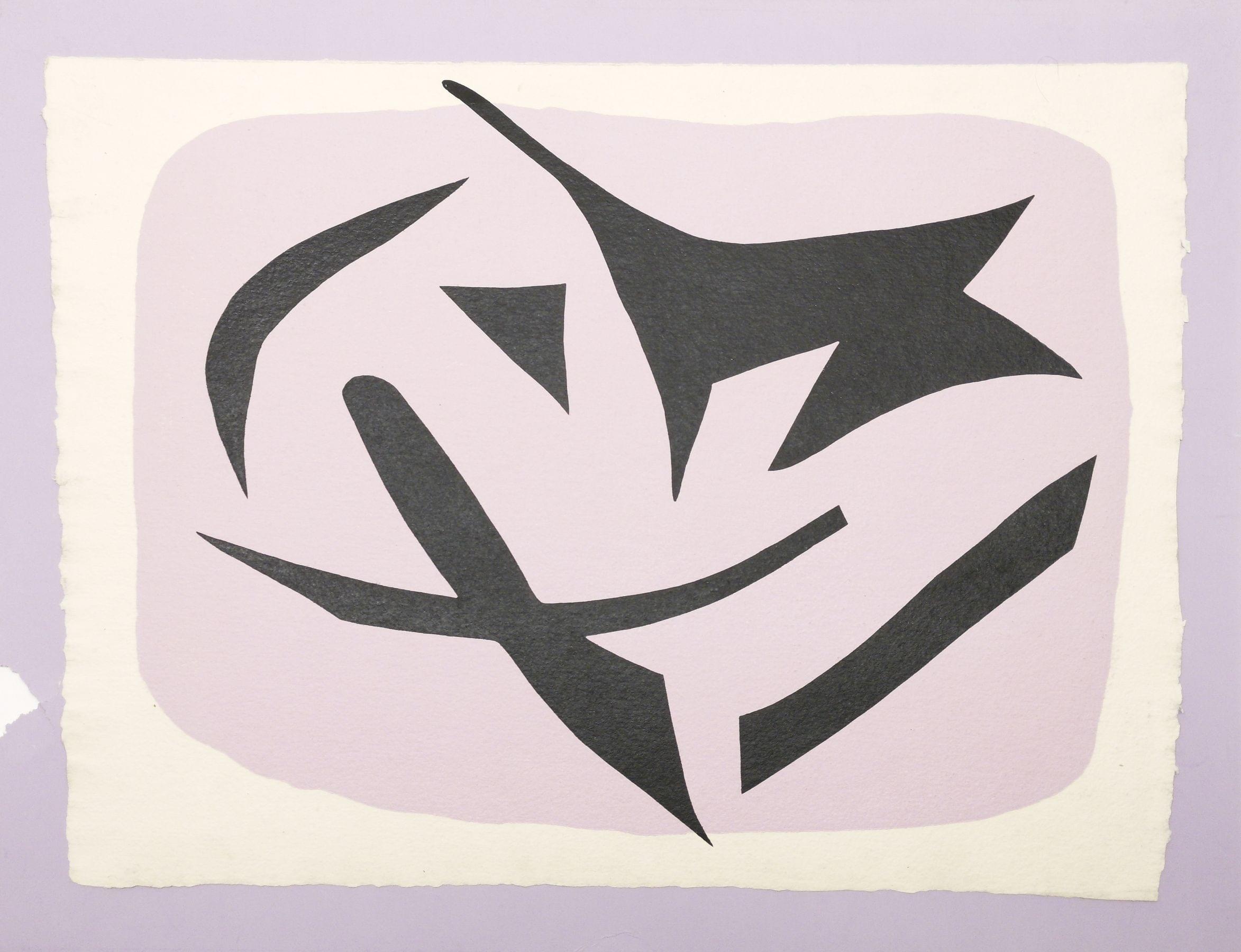 Vol d'oiseaux noirs sur fond rose, bois sur chiffon Auvergne. Planche issue de « si je mourais là-bas » Guillaume Apollinaire, signature plus lisible, 47,5x36,5 cm. Dora Vallier, 181.