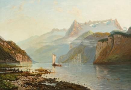 Vue d'un lac animé, huile sur toile, signée et datée 1870, 32x46...