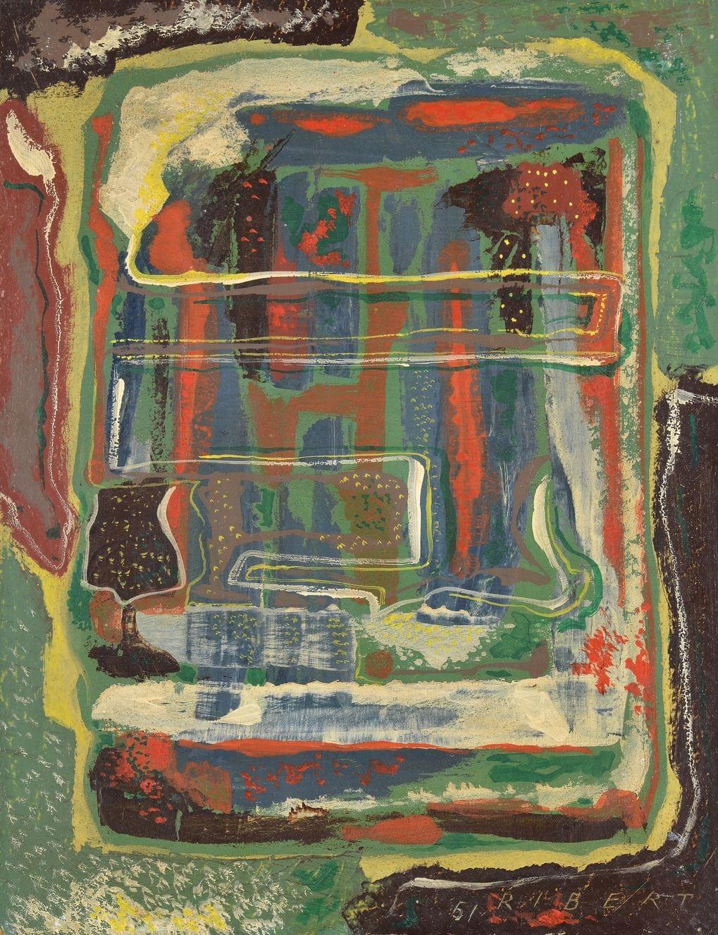Composition abstraite, huile sur carton, signée Ribert, datée 51 et cachet Fustier au dos, 40x30 cm