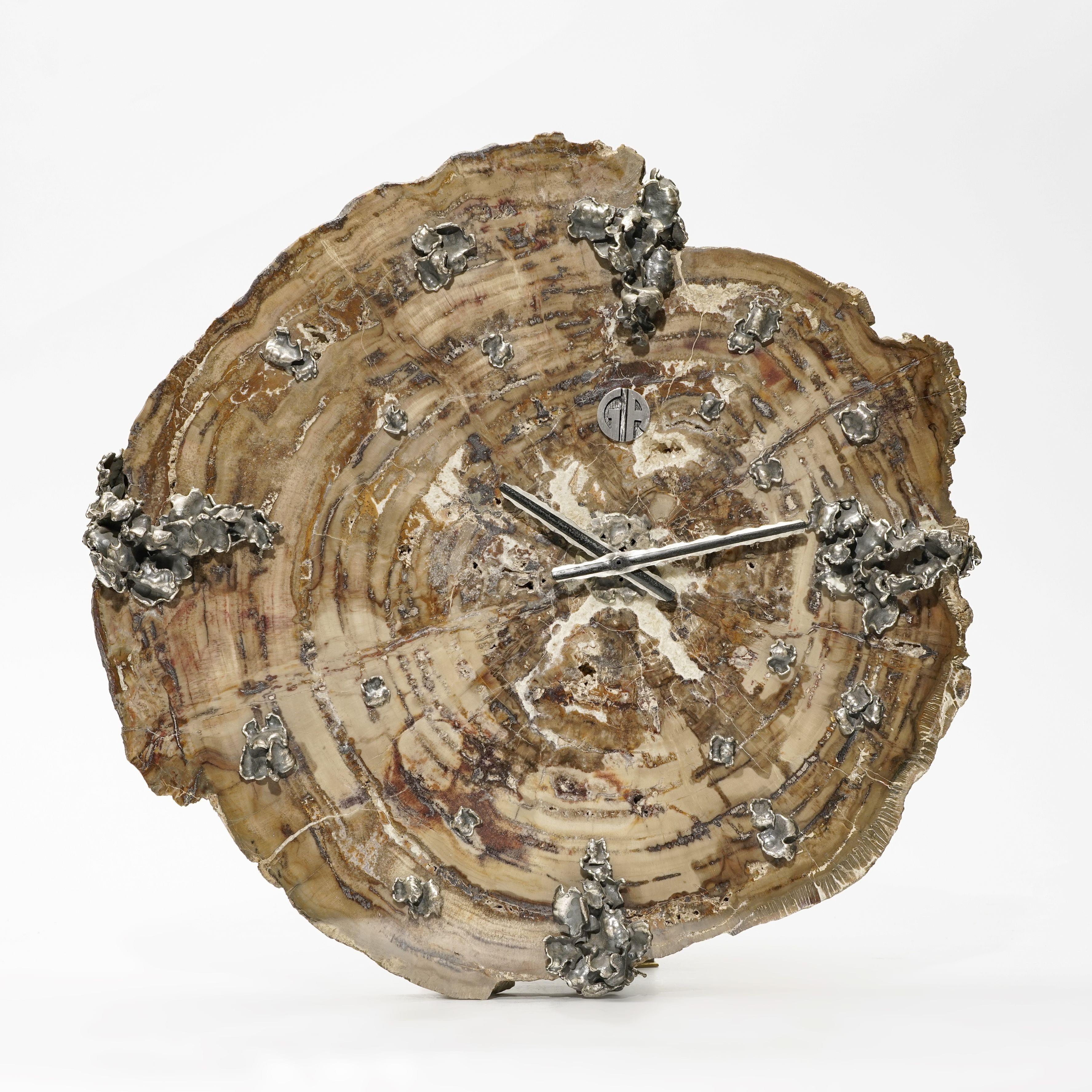 Horloge murale avec mouvement quartz, bois pétrifié et argent, venant de la boutique, rue de la Corraterie 24