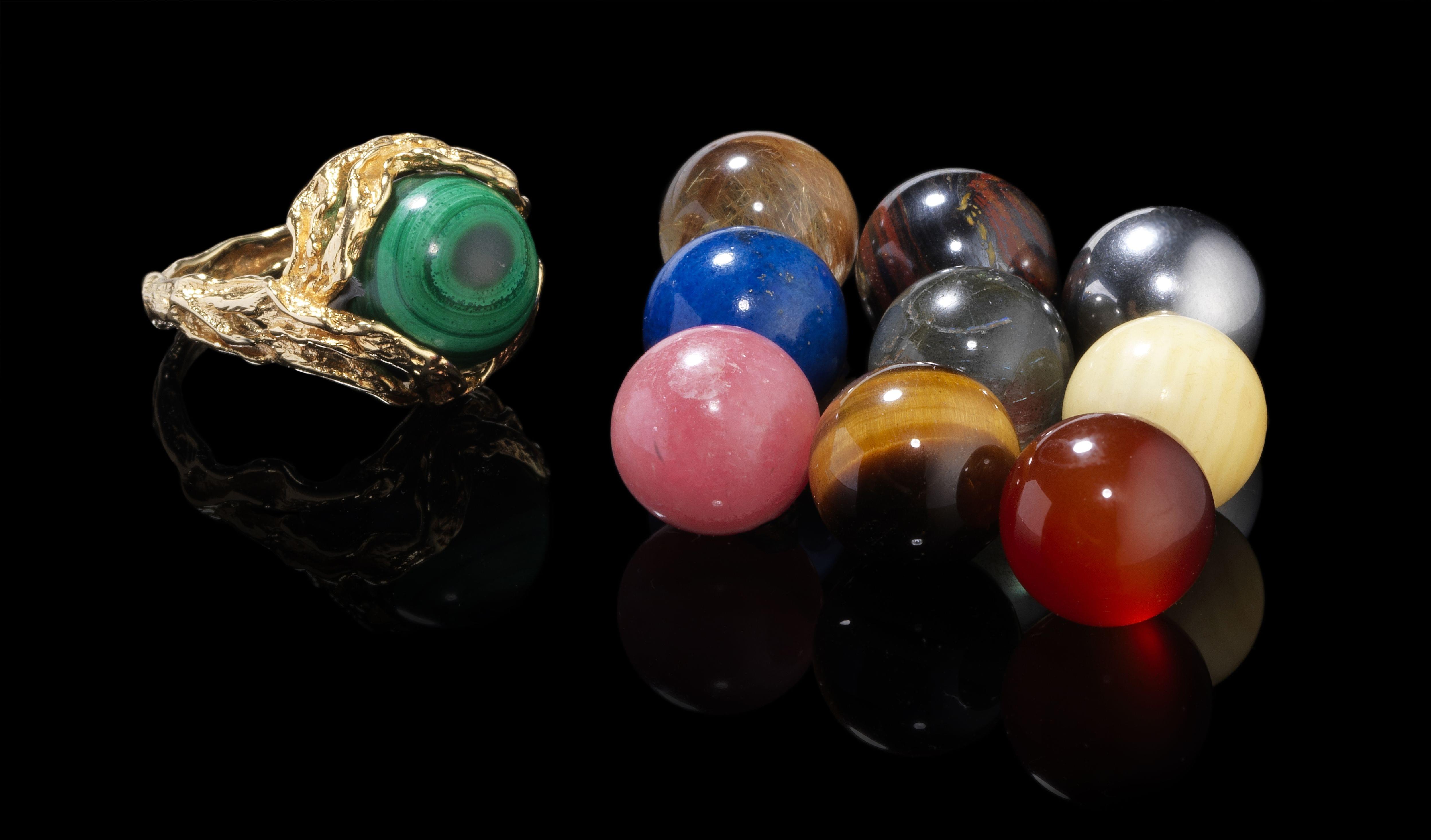 Accompagnée de dix billes notamment en malachite, labradorite, œil de tigre, cornaline et hématite, or 750, doigt 53-13, 6 g
