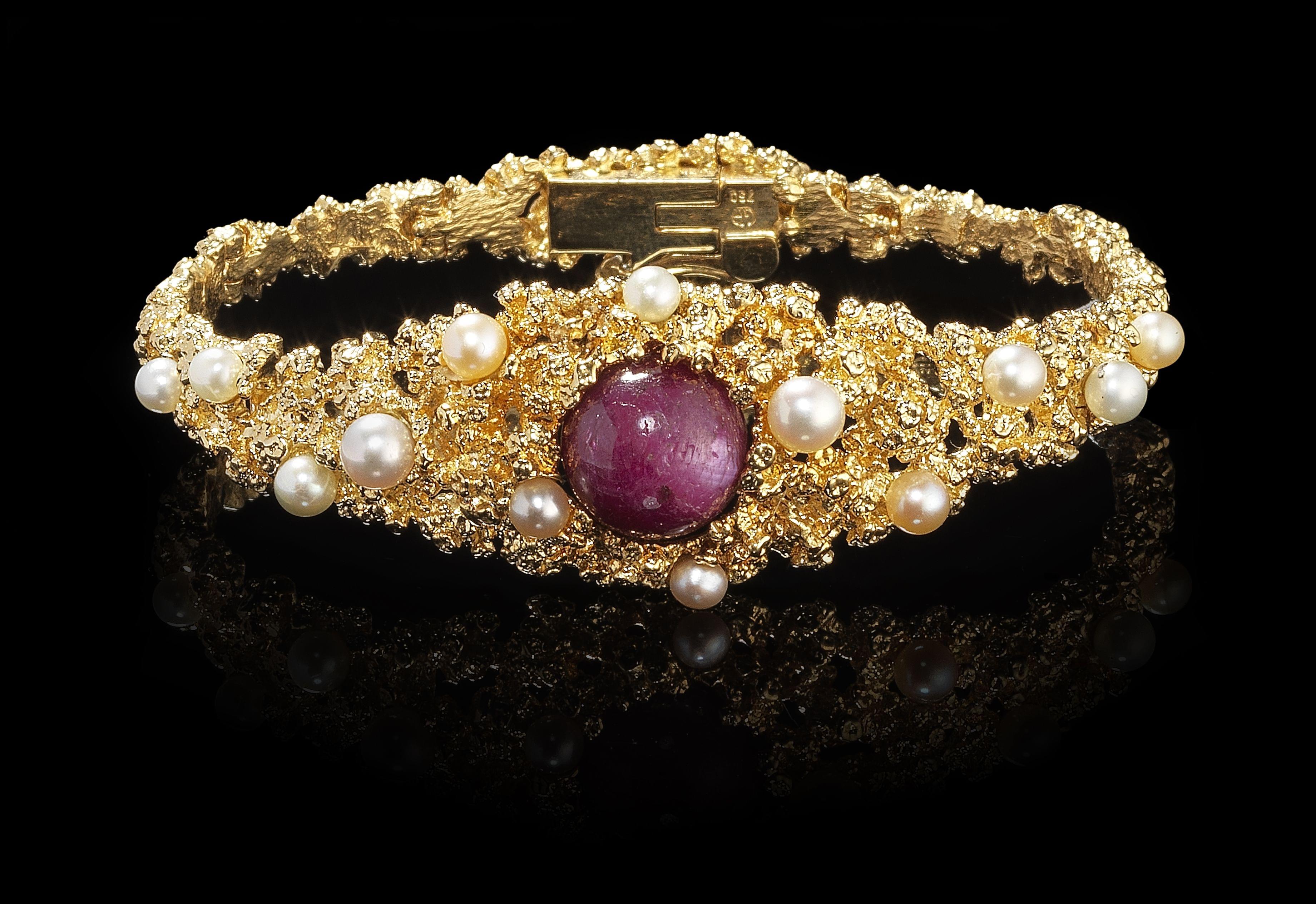 119. Gilbert Albert, bracelet ajouré à motif de granulation centré d'une perle de rubis (D env. 10 mm) et ponctué de perles