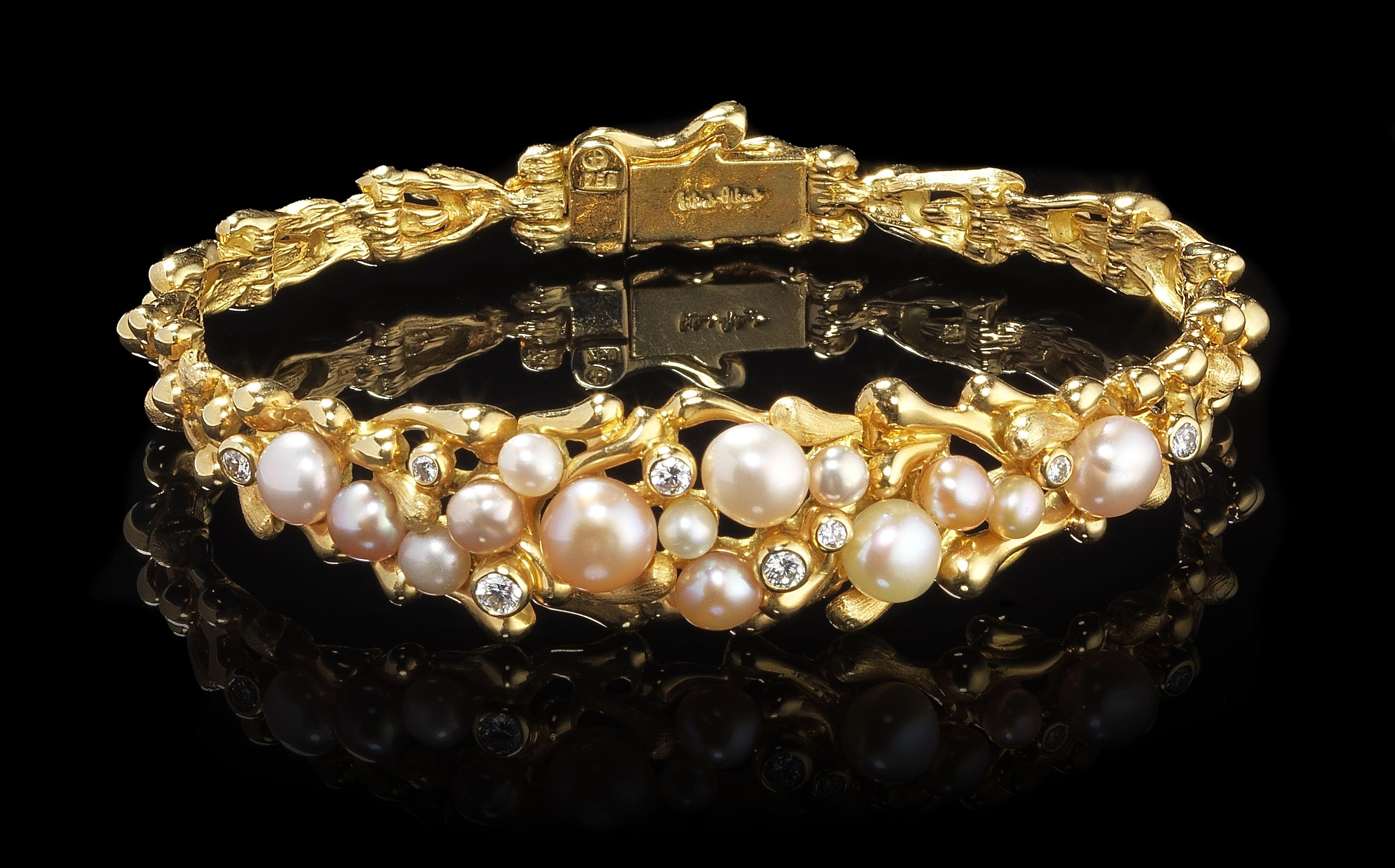 116. Gilbert Albert, bracelet jonc stylisé ouvrant pavé de perles en bouton rehaussées de diamants