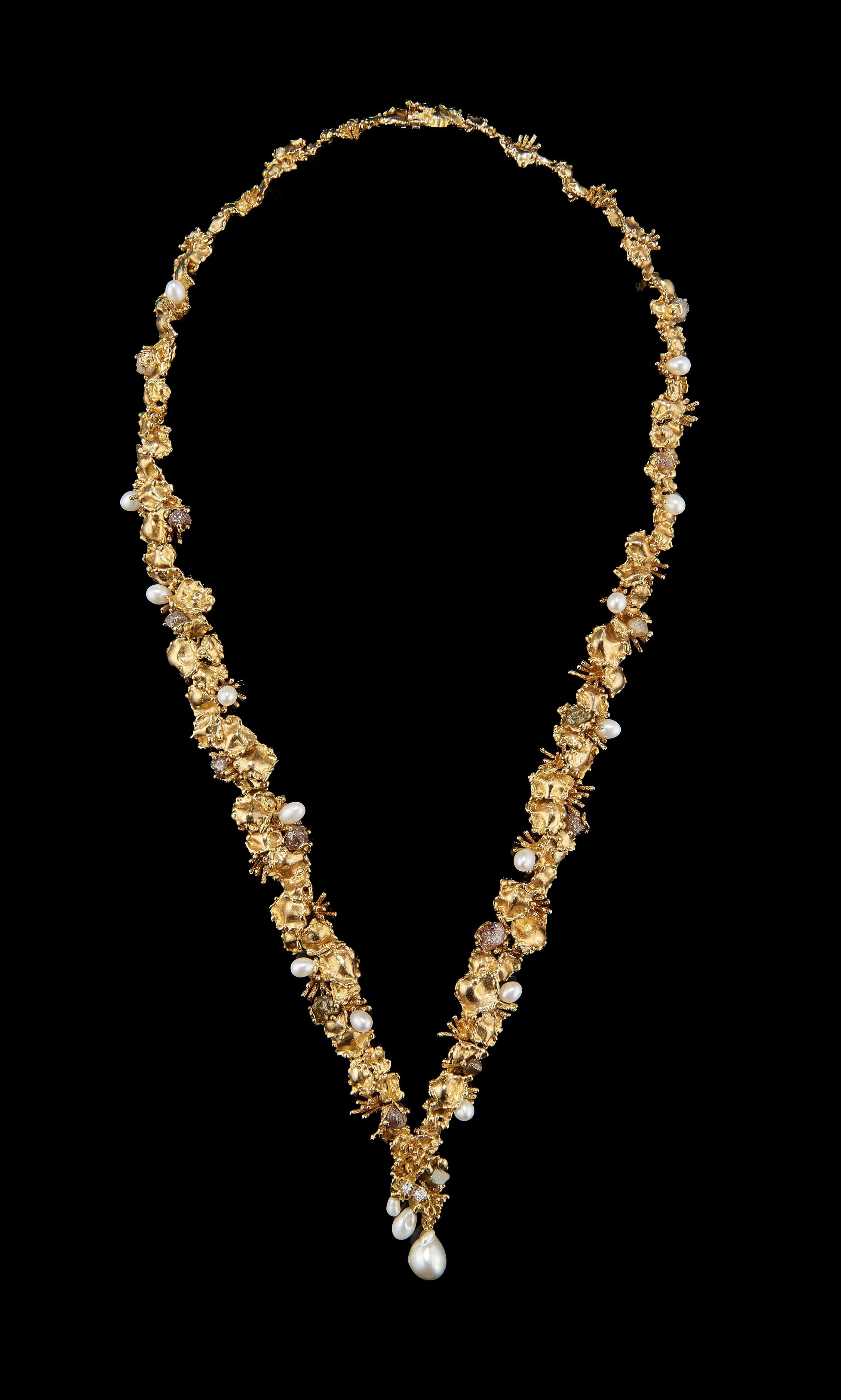 985. Gilbert Albert, collier en or froissé ponctué de perles et de bruts de diamant
