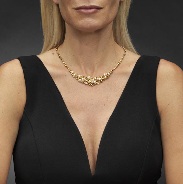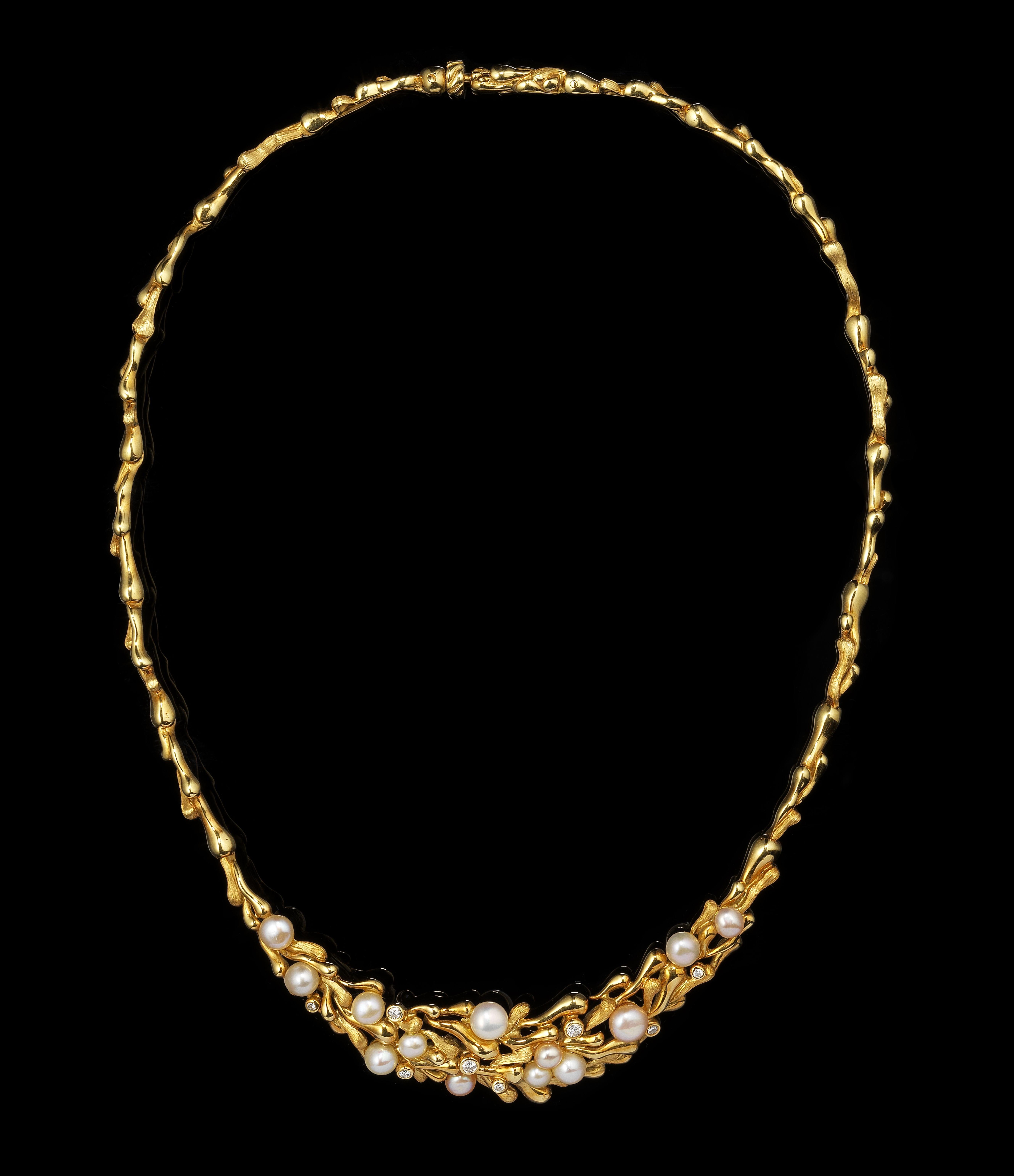 117. Gilbert Albert, collier tour de cou stylisé pavé de perles en bouton rehaussées de diamants