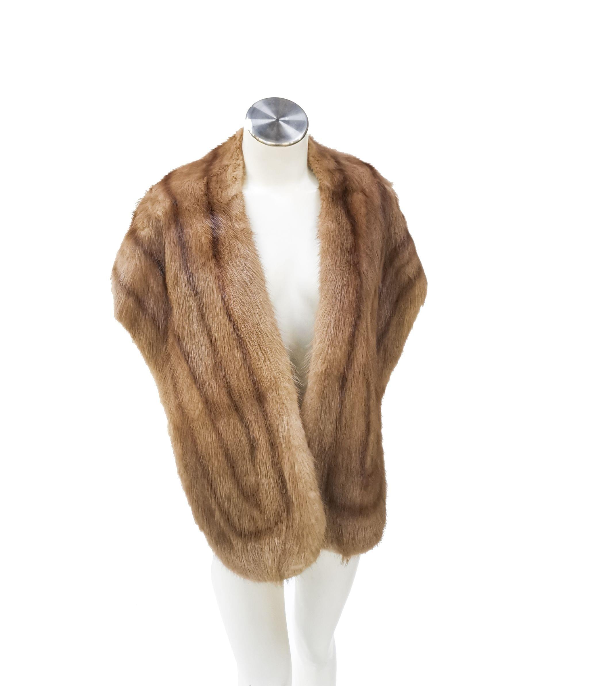 Probablement vison crème, intérieur en tissu argenté, fermetures à crochets. On joint une étole en vison brun clair et tissu brun.