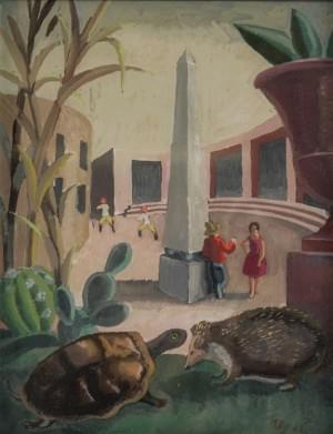 Tortue et hérisson devant une place animée à l'obélisque, peintu...