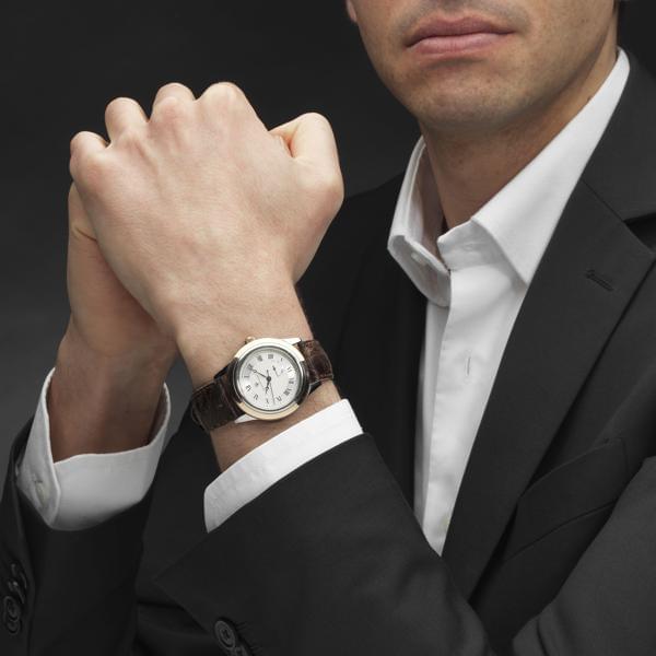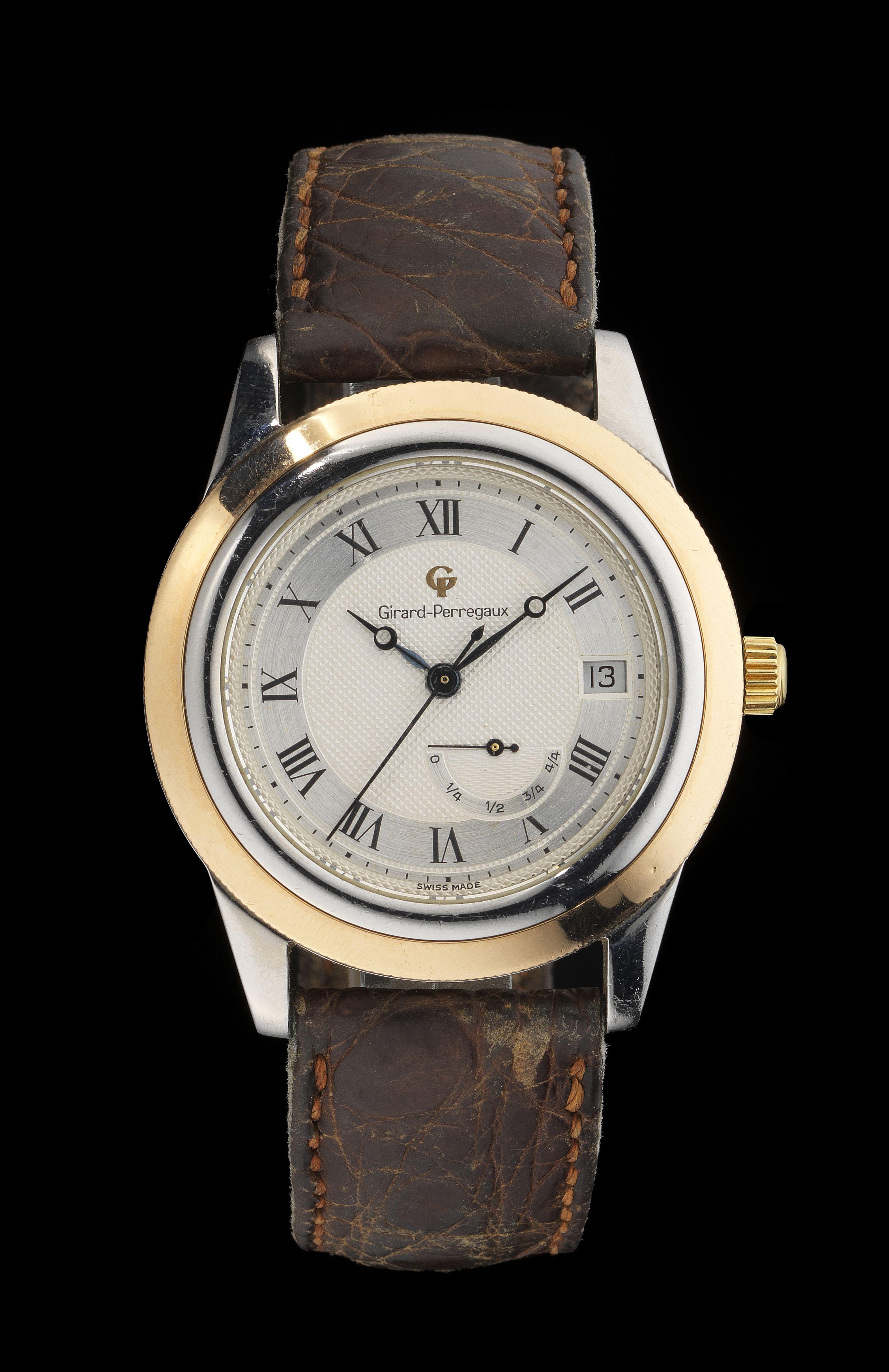 Cadran guillauché argenté, aiguilles bleuies, chiffres romains noirs, date à guichet à 3h, réserve de marche, or et acier,réf. 1020, D 37 mm
