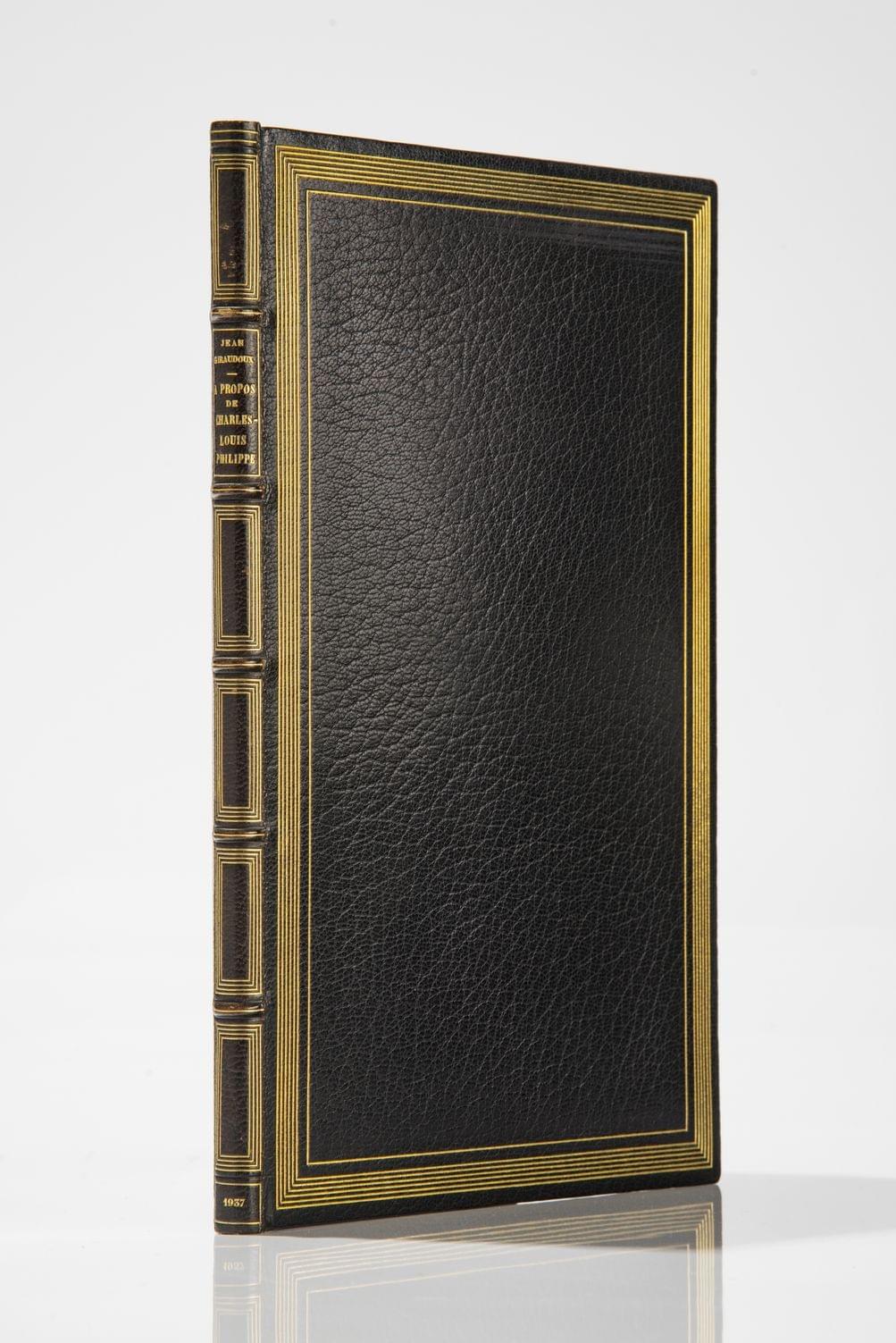 Un vol. in-8°, maroquin bleu nuit, dos à caissons soulignés de quatre filets dorés, plats à décor d'un double rang de sept filets dorés, double filet intérieur, gardes de moire lie-de-vin, tranches dorées non rognées, étui. Reliure de MAYLANDER. Condition exceptionnelle de cet Extrait de la NRF en date du 1er octobre 1937.