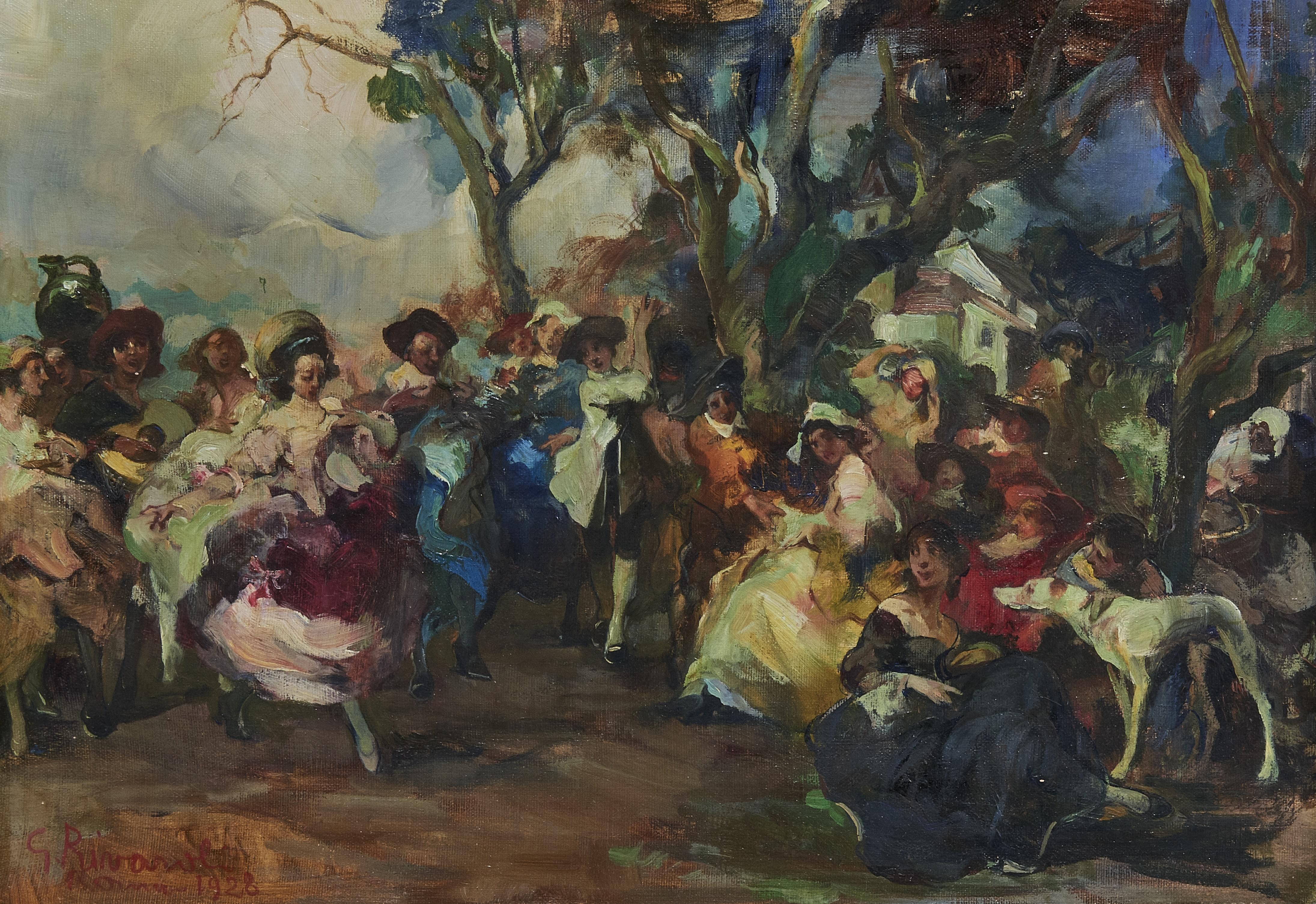 Fête du village, huile sur toile, signée et datée 1928, 40x55 cm