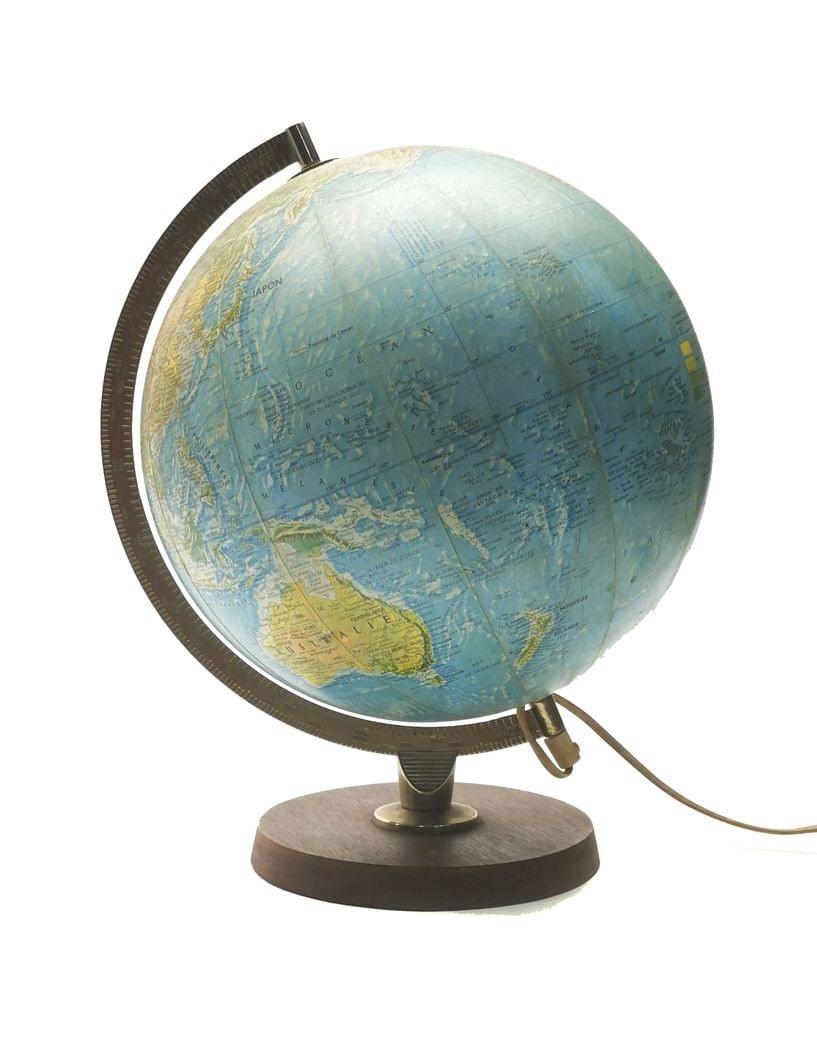 Métal, bois et papier imprimé sur globe en verre ou plexi, H 38 cm